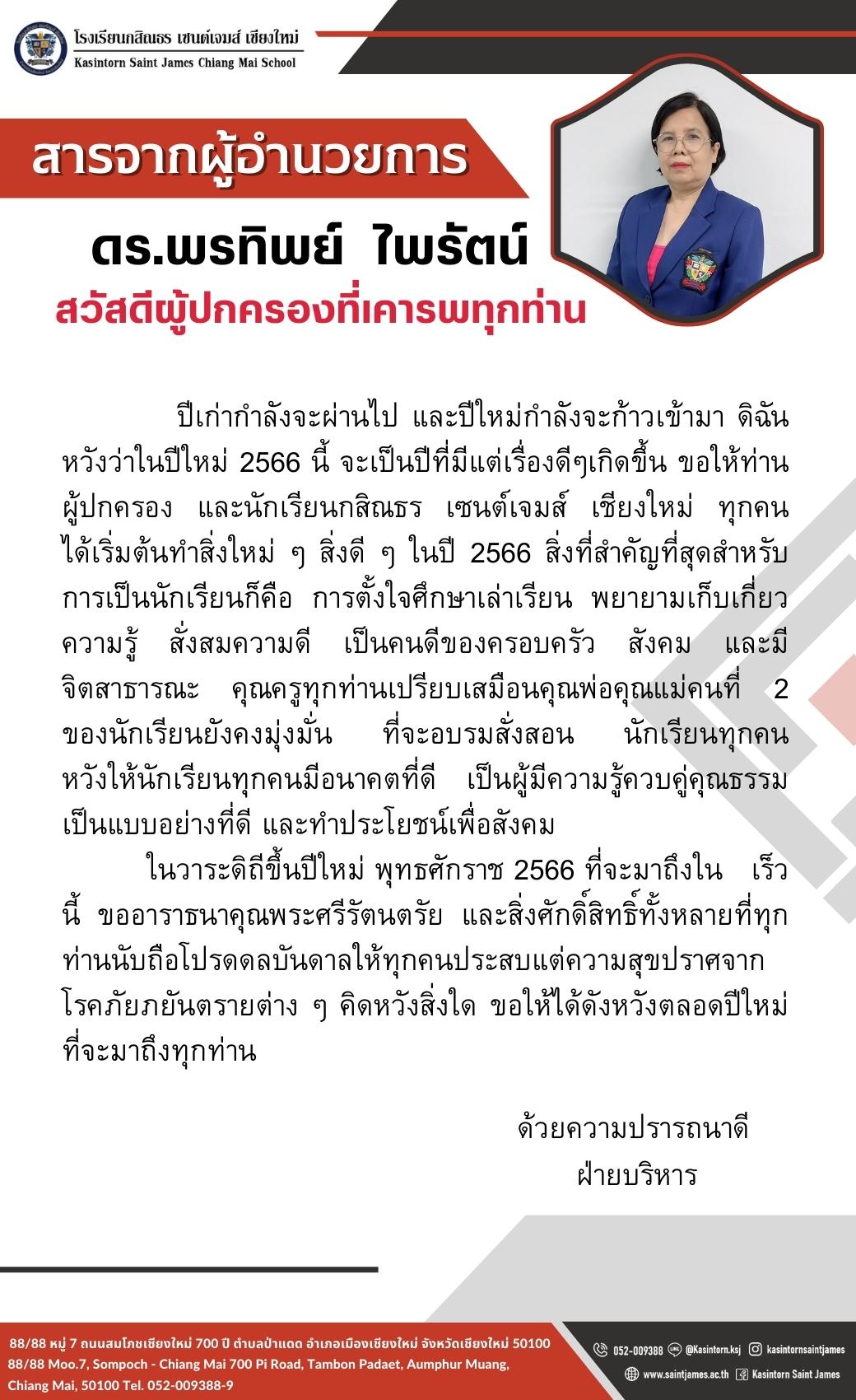 โรงเรียนกสิณธร เซนต์เจมส์ เชียงใหม่ ขอส่งความสุข และ คำอวยพร จากนักเรียนของโรงเรียนมายังทุกท่าน ขอให้ทุกท่าน มีสุขภาพแข็งแรง ปราศจากโรคภัย กิจการงานเจริญรุ่งเรือง มีแต่ความสุขสำราญ คิดสิ่งใดขอให้สมปรารถนาร่ำรวยเงินทอง ยิ่ง ๆ ขึ้นไป