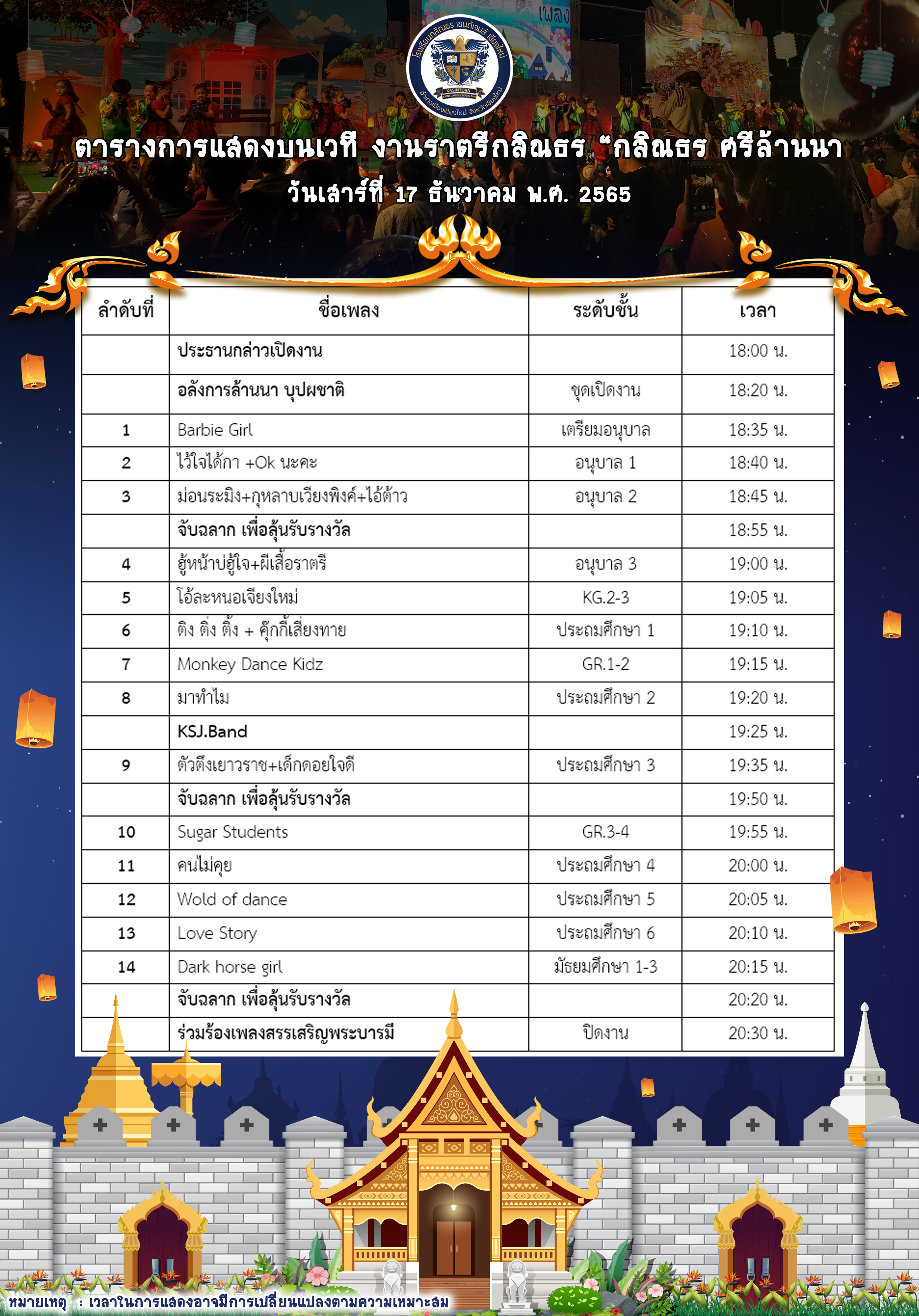 ขอแสดงความชื่นชม เด็กหญิงณัฐณิชา วัฒนเมธีกุล (น้องโปรแกรม) ระดับชั้น อนุบาล 3 โปรแกรมสามภาษา (TEP) หนูน้อยนพมาศโรงเรียนกสิณธร เซนต์เจมส์ เชียงใหม่ เป็นตัวแทน นั่งกระทงของเทศบาลนครเชียงใหม่ ในงาน "ประเพณีเดือนยี่เป็ง เชียงใหม่ 2564"