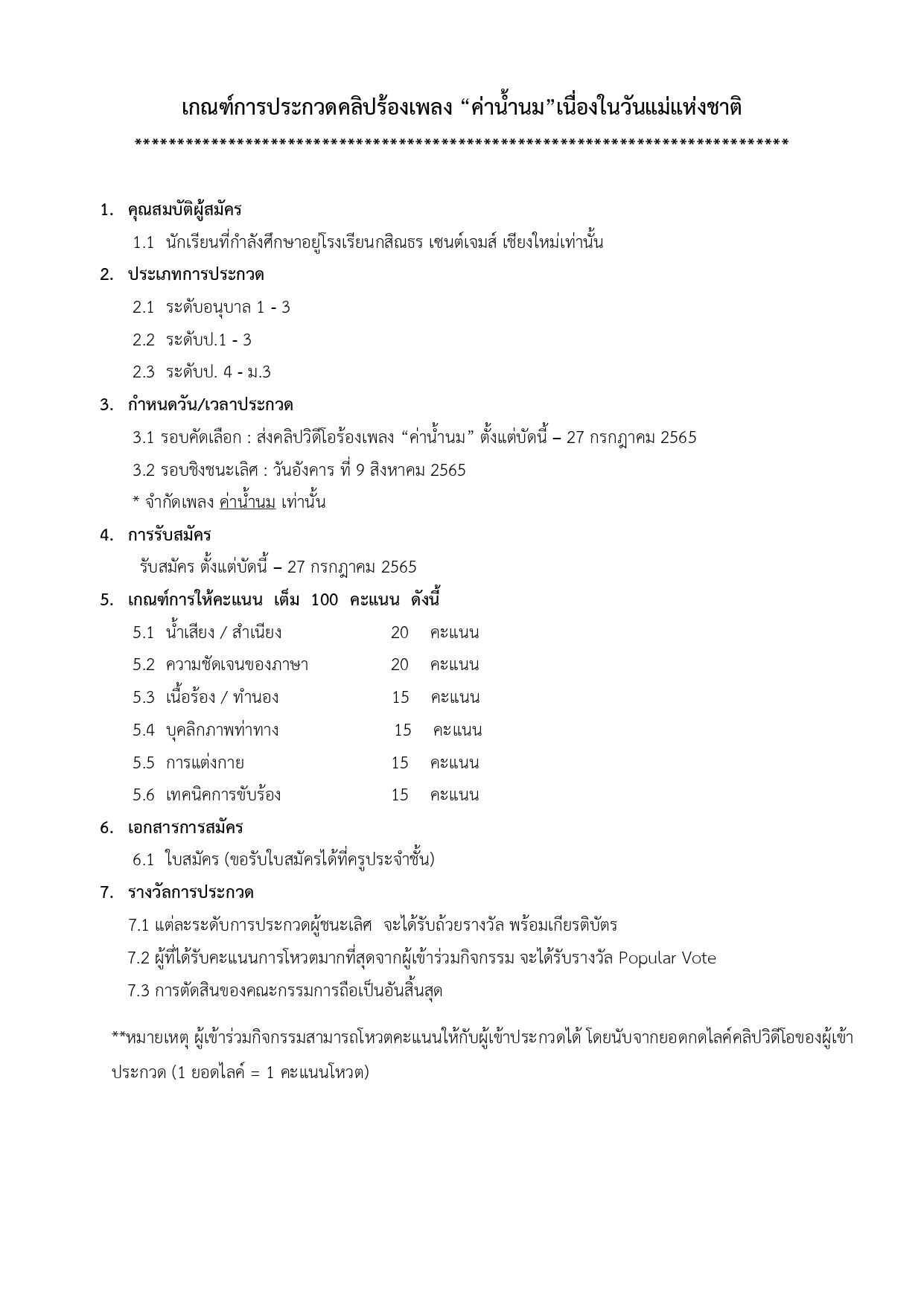 ขอเชิญชวนนักเรียนโรงเรียนกสิณธร เซนต์เจมส์ เชียงใหม่ เข้าร่วมประกวดร้องเพลง โดยการส่งคลิปวิดีโอร้องเพลง "ค่าน้ำนม" ให้ทางคุณครูประจำชั้น ตั้งแต่บัดนี้ - 27 ก.ค 2565