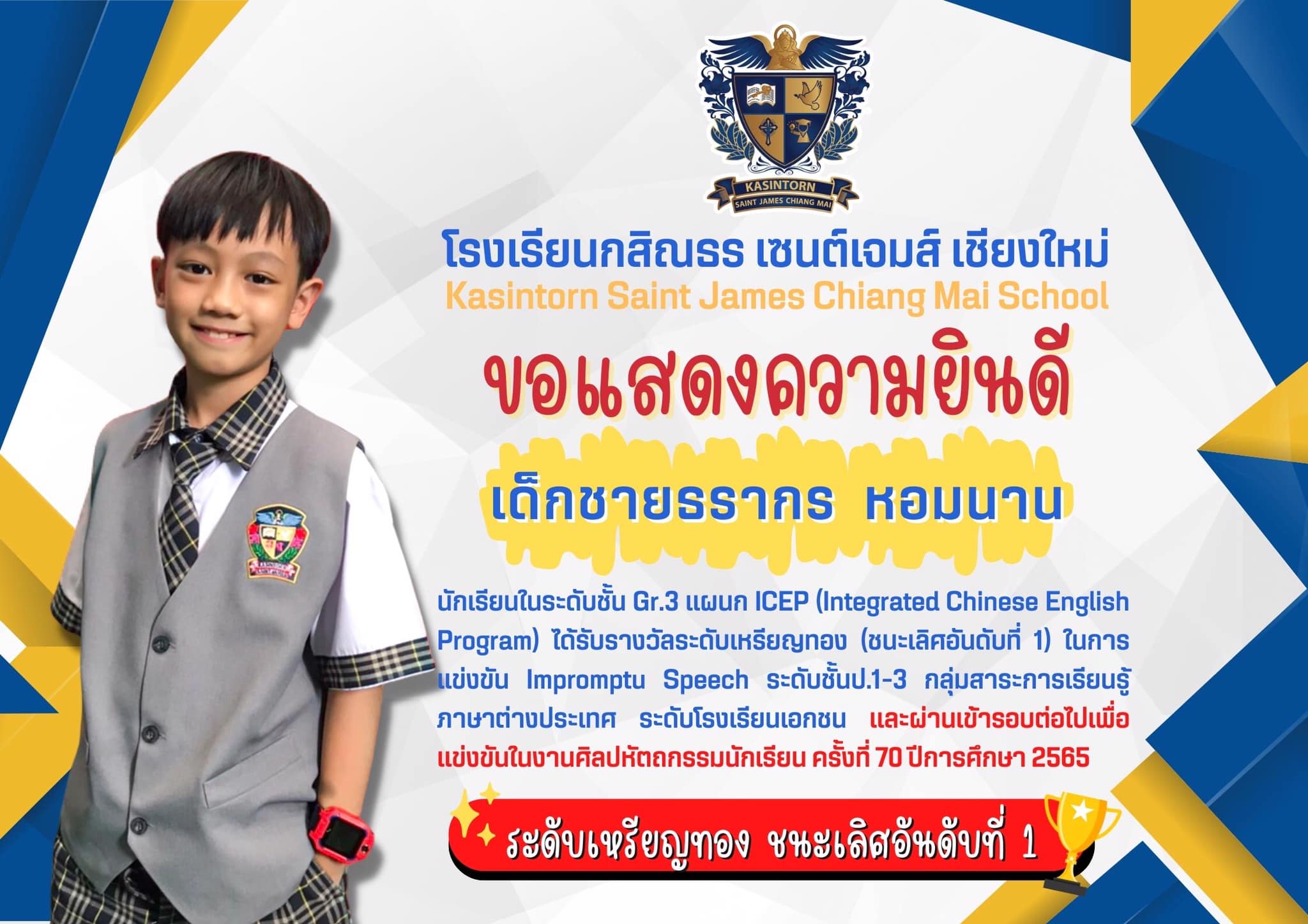 🥇เเด็กชายธรากร หอมนาน นักเรียนในระดับชั้น Gr.3 แผนก ICEP (Integrated Chinese English Program) ได้รับรางวัลระดับเหรียญทอง (ชนะเลิศอันดับที่ 1) ในการแข่งขัน Impromptu Speech ระดับชั้นป.1-3 กลุ่มสาระการเรียนรู้ภาษาต่างประเทศ ระดับโรงเรียนเอกชน และผ่านเข้ารอบต่อไปเพื่อแข่งขันในงานศิลปหัตถกรรมนักเรียน ครั้งที่ 70 ปีการศึกษา 2565