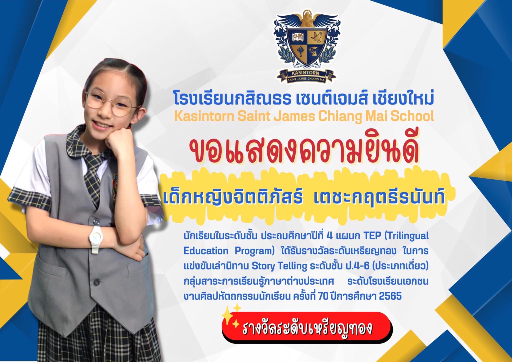 🥇เเด็กหญิงจิตติภัสร์ เตชะกฤตธีรนันท์ นักเรียนในระดับชั้น ประถมศึกษาปีที่ 4 แผนก TEP (Trilingual Education Program) ได้รับรางวัลระดับเหรียญทอง ในการแข่งขันเล่านิทาน Story Telling ระดับชั้น ป.4-6 (ประเภทเดี่ยว) กลุ่มสาระการเรียนรู้ภาษาต่างประเทศ ระดับโรงเรียนเอกชน