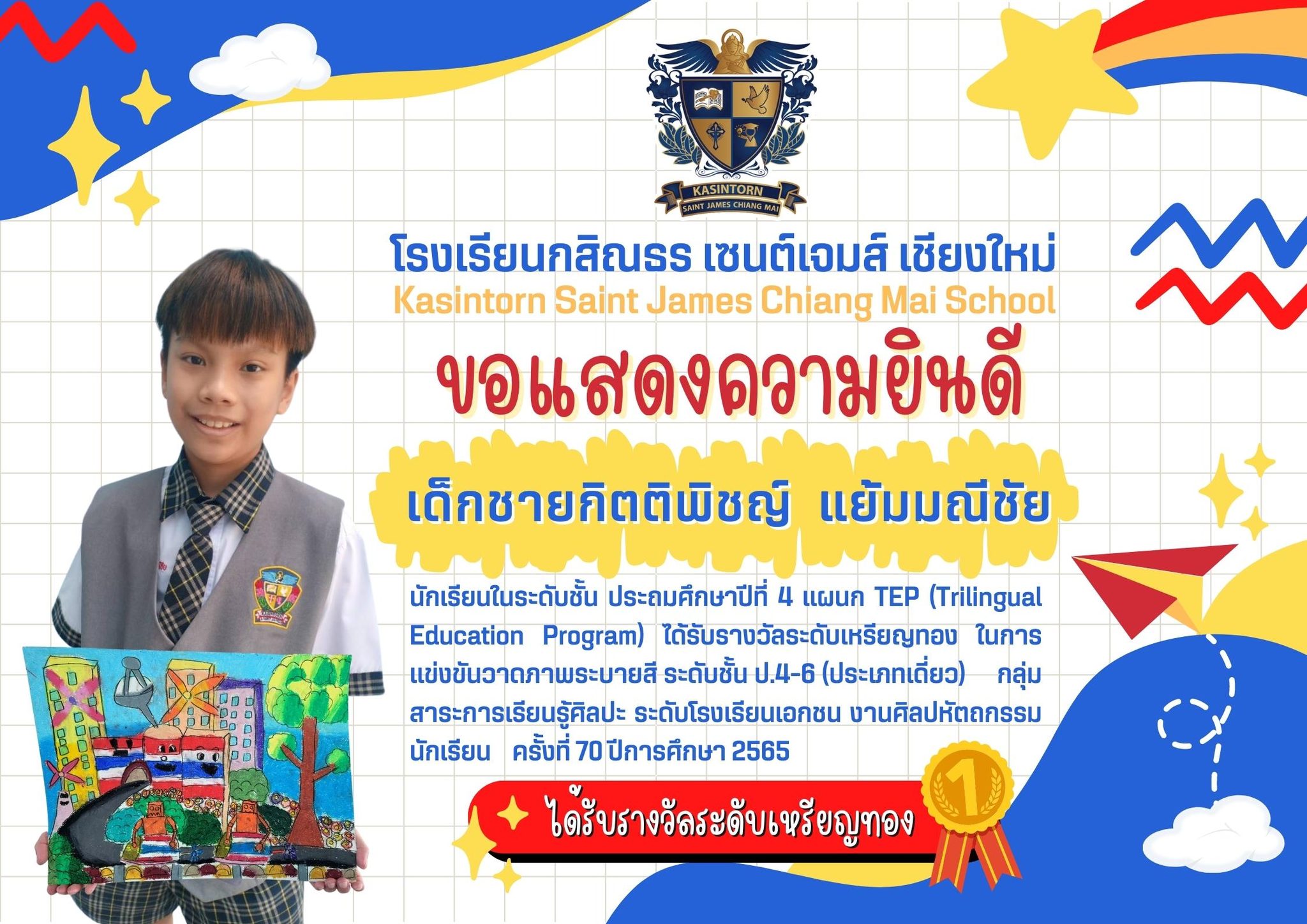 🥇เด็กชายกิตติพิชญ์ แย้มมณีชัย นักเรียนในระดับชั้น ประถมศึกษาปีที่ 4 แผนก TEP (Trilingual Education Program) ได้รับรางวัลระดับเหรียญทอง ในการแข่งขันวาดภาพระบายสี ระดับชั้น ป.4-6 (ประเภทเดี่ยว) กลุ่มสาระการเรียนรู้ศิลปะ ระดับโรงเรียนเอกชน