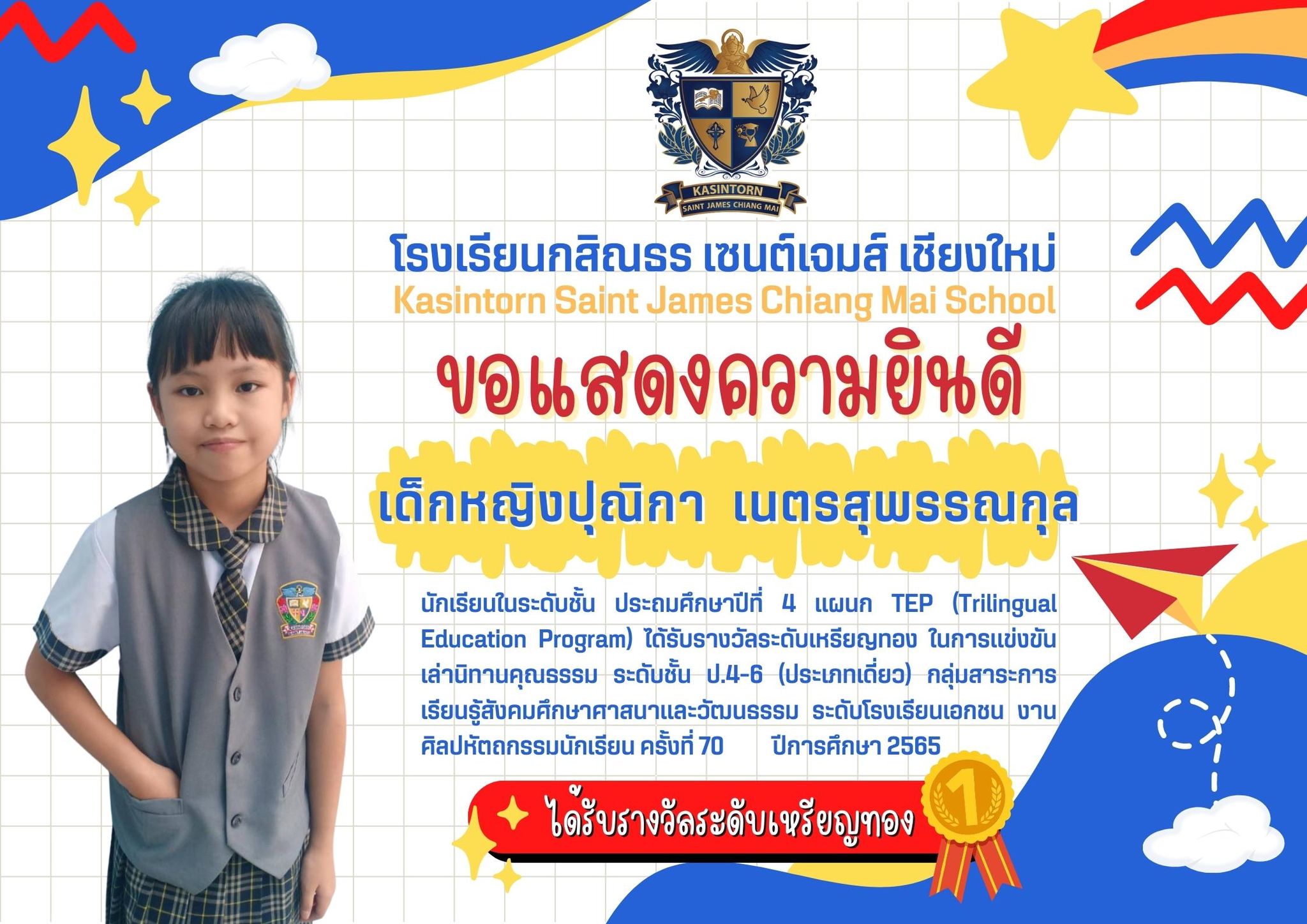 🥇เด็กหญิงปุณิกา เนตรสุพรรณกุล นักเรียนในระดับชั้น ประถมศึกษาปีที่ 4 แผนก TEP (Trilingual Education Program) ได้รับรางวัลระดับเหรียญทอง ในการแข่งขันเล่านิทานคุณธรรม ระดับชั้น ป.4-6 (ประเภทเดี่ยว) กลุ่มสาระการเรียนรู้สังคมศึกษาศาสนาและวัฒนธรรม ระดับโรงเรียนเอกชน
