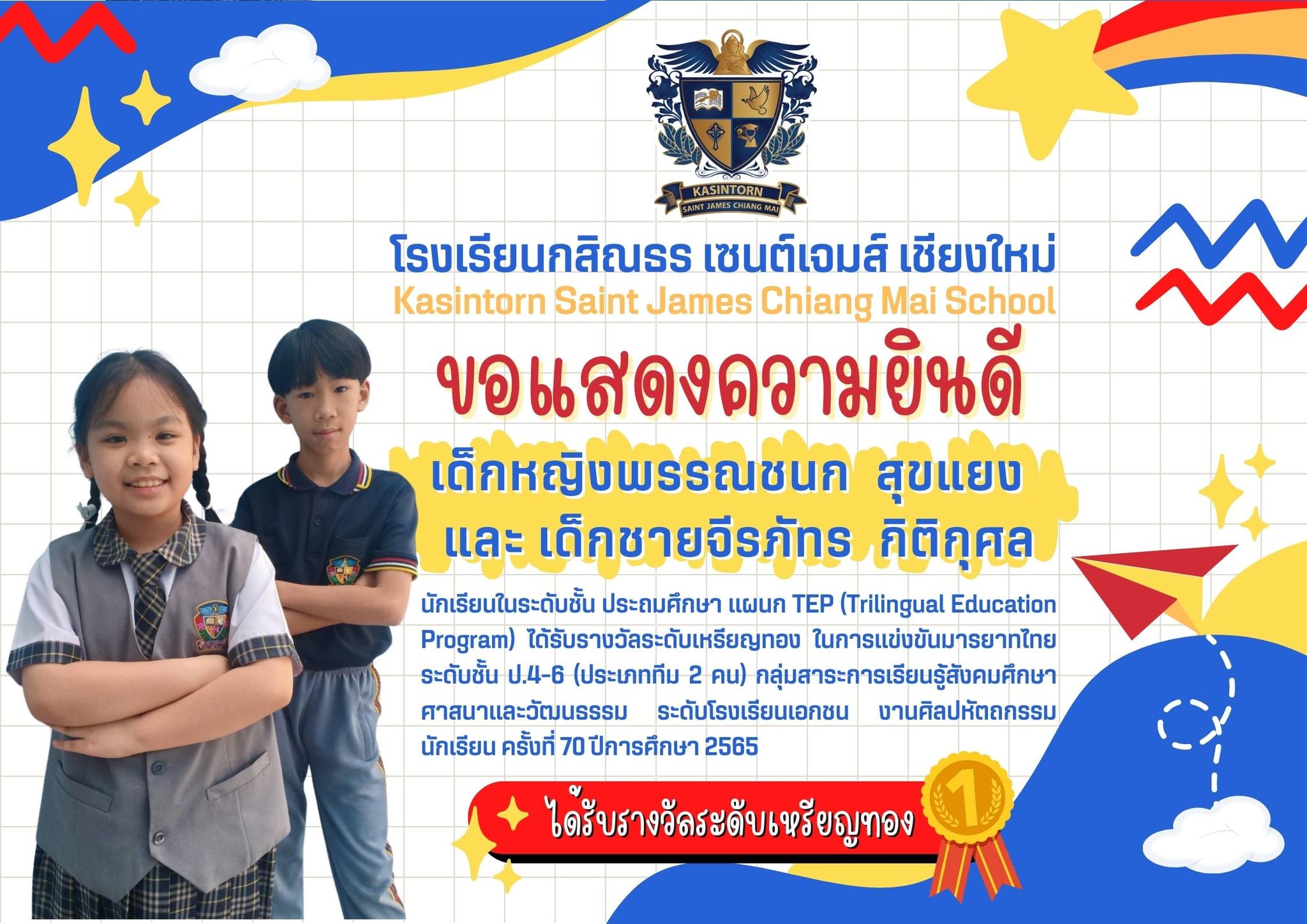 🥇เด็กหญิงพรรณชนก สุขแยง และ เด็กชายจีรภัทร กิติกุศล นักเรียนในระดับชั้น ประถมศึกษา แผนก TEP (Trilingual Education Program) ได้รับรางวัลระดับเหรียญทอง ในการแข่งขันมารยาทไทย ระดับชั้น ป.4-6 (ประเภททีม 2 คน) กลุ่มสาระการเรียนรู้สังคมศึกษาศาสนาและวัฒนธรรม ระดับโรงเรียนเอกชน