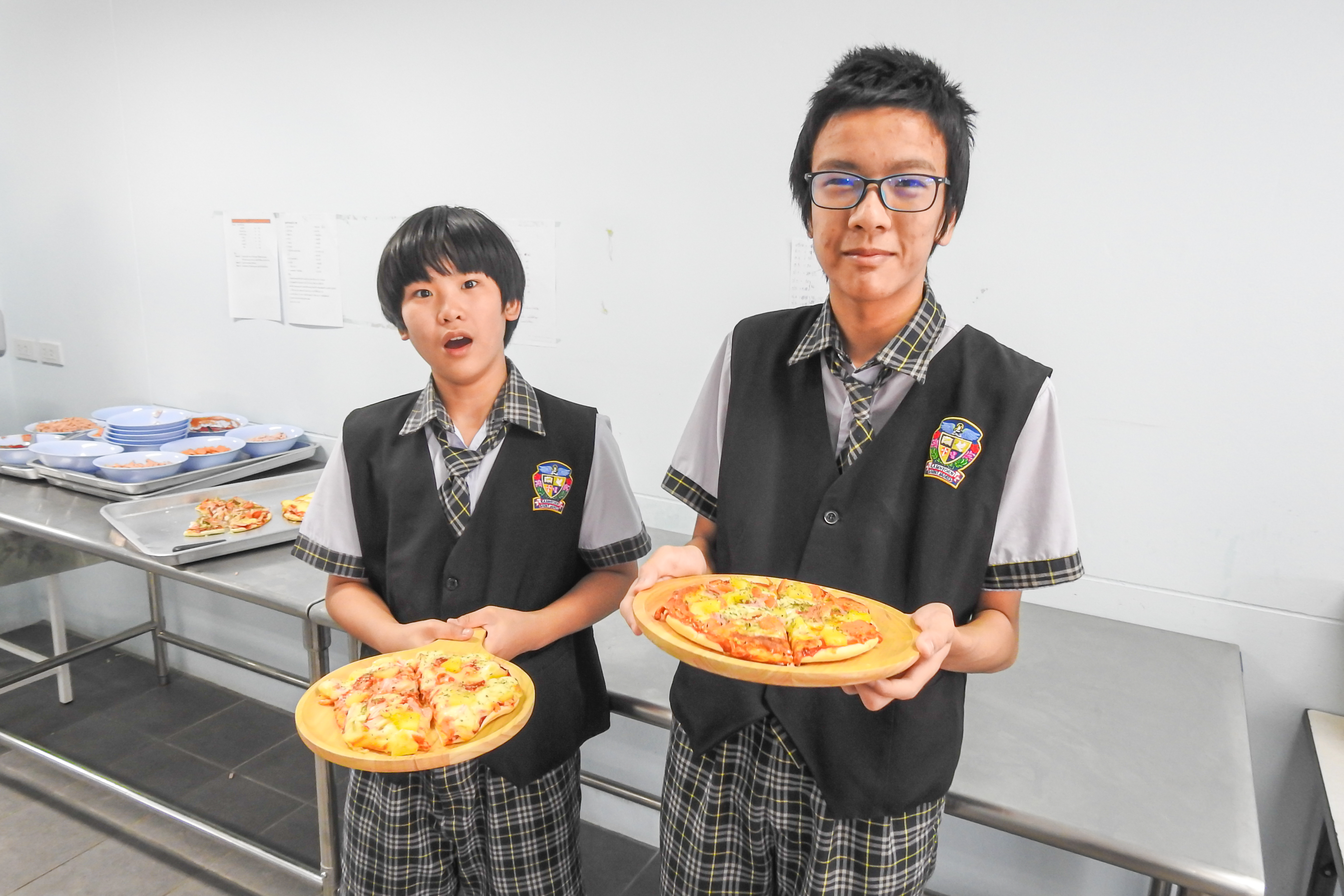 大家快来!看看初中学长制作的披萨!这些是新口味的披萨,你可以加你喜欢的料。
