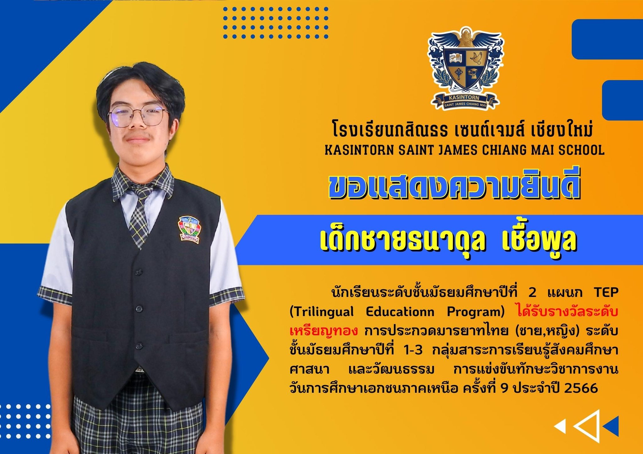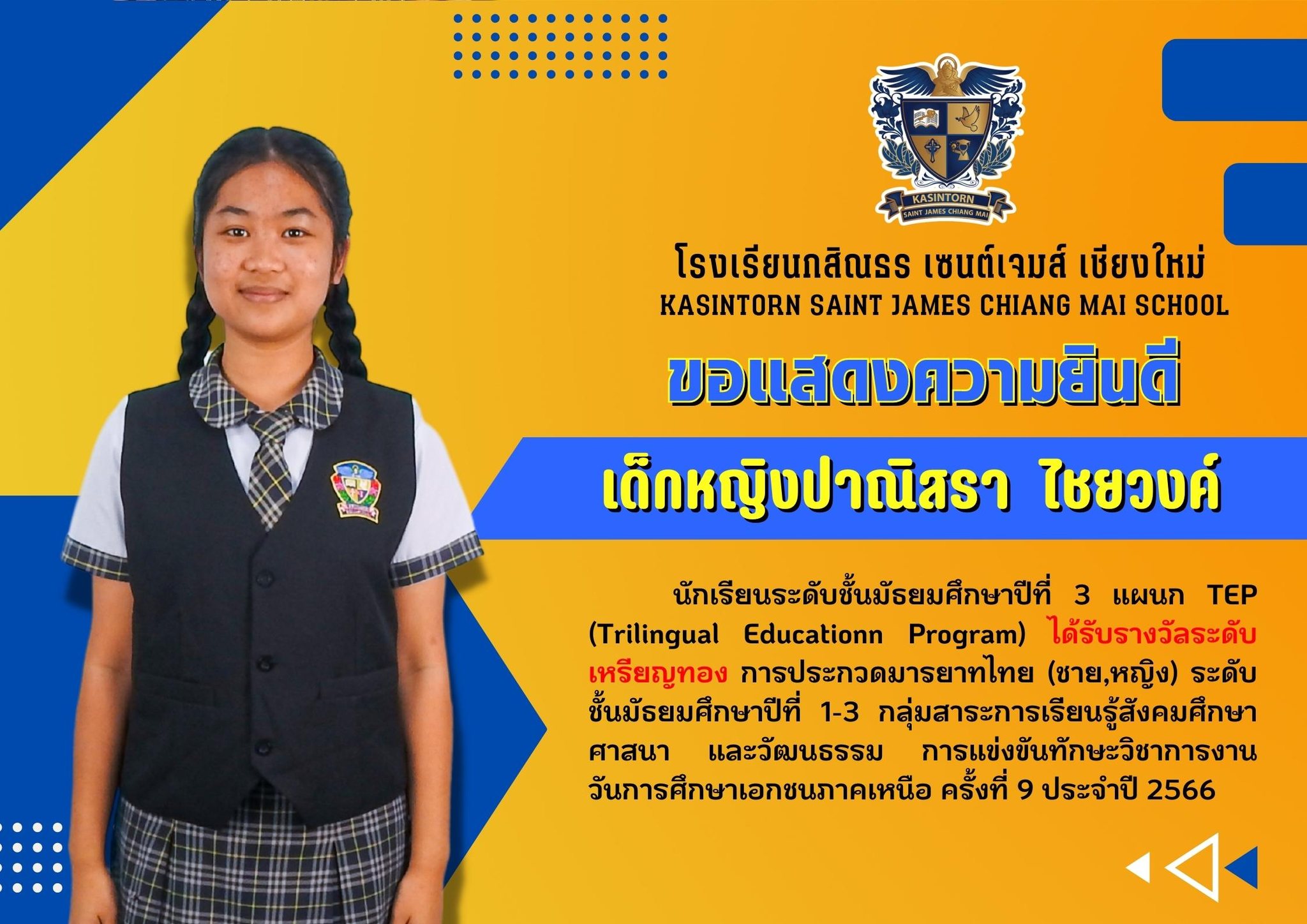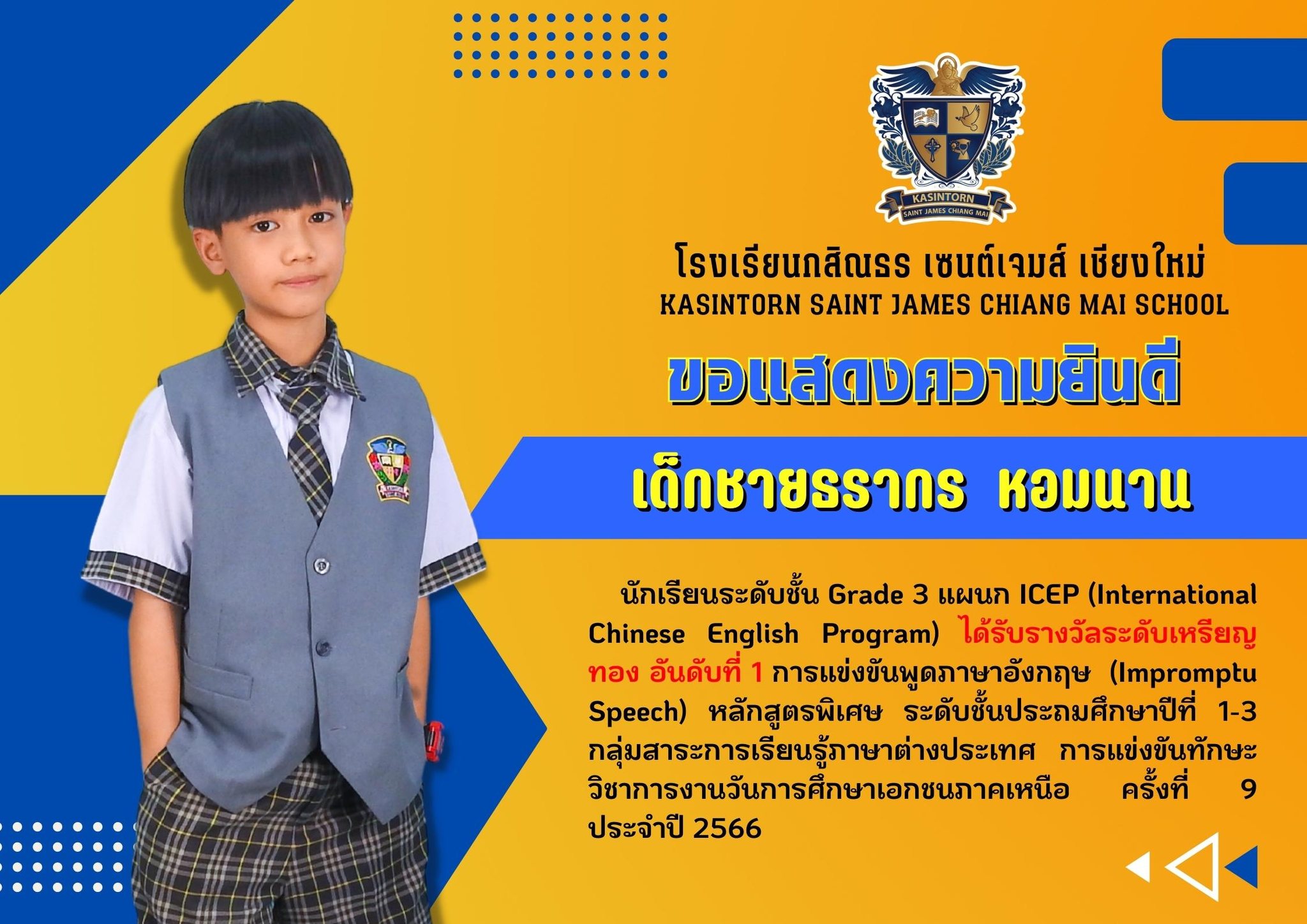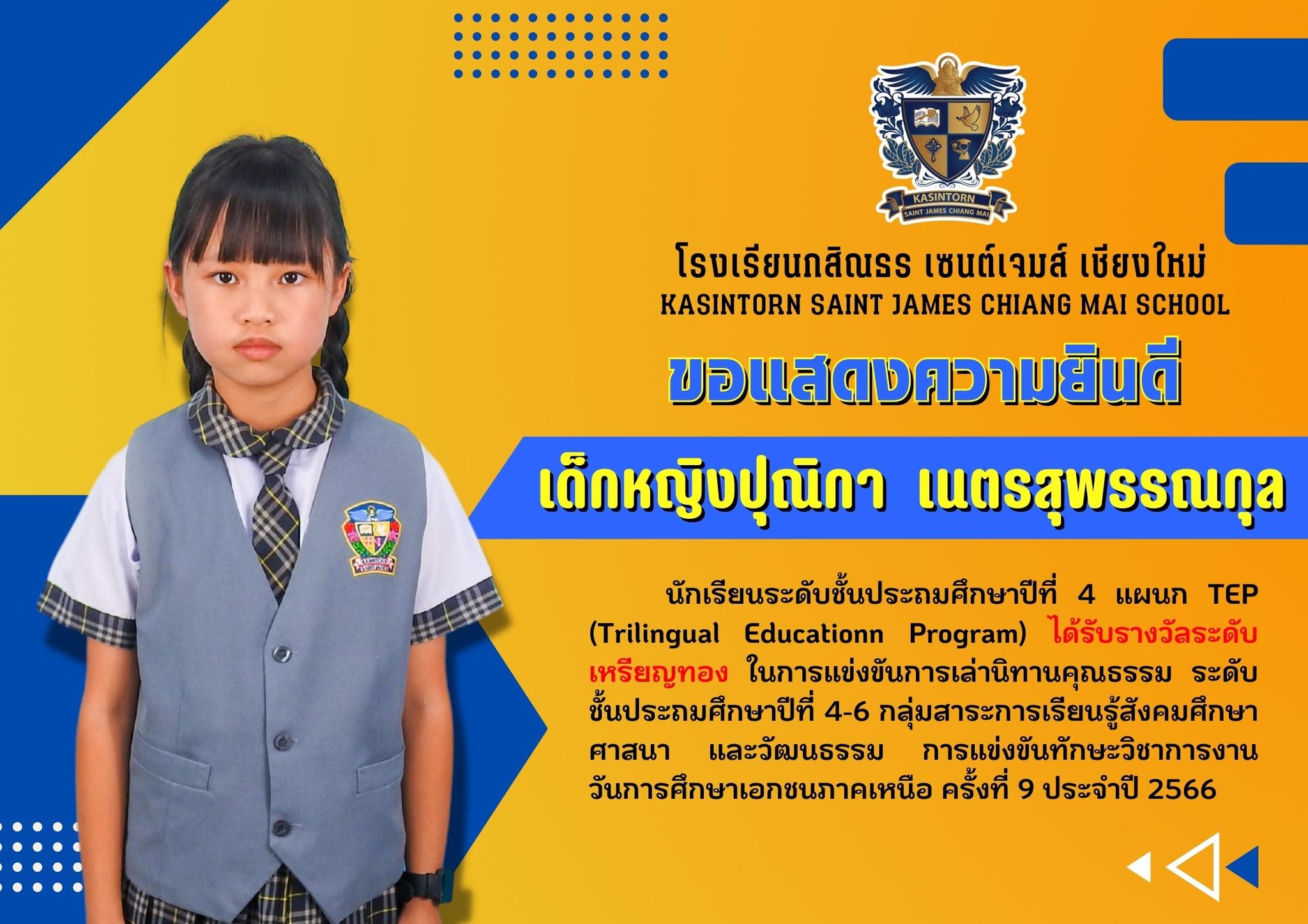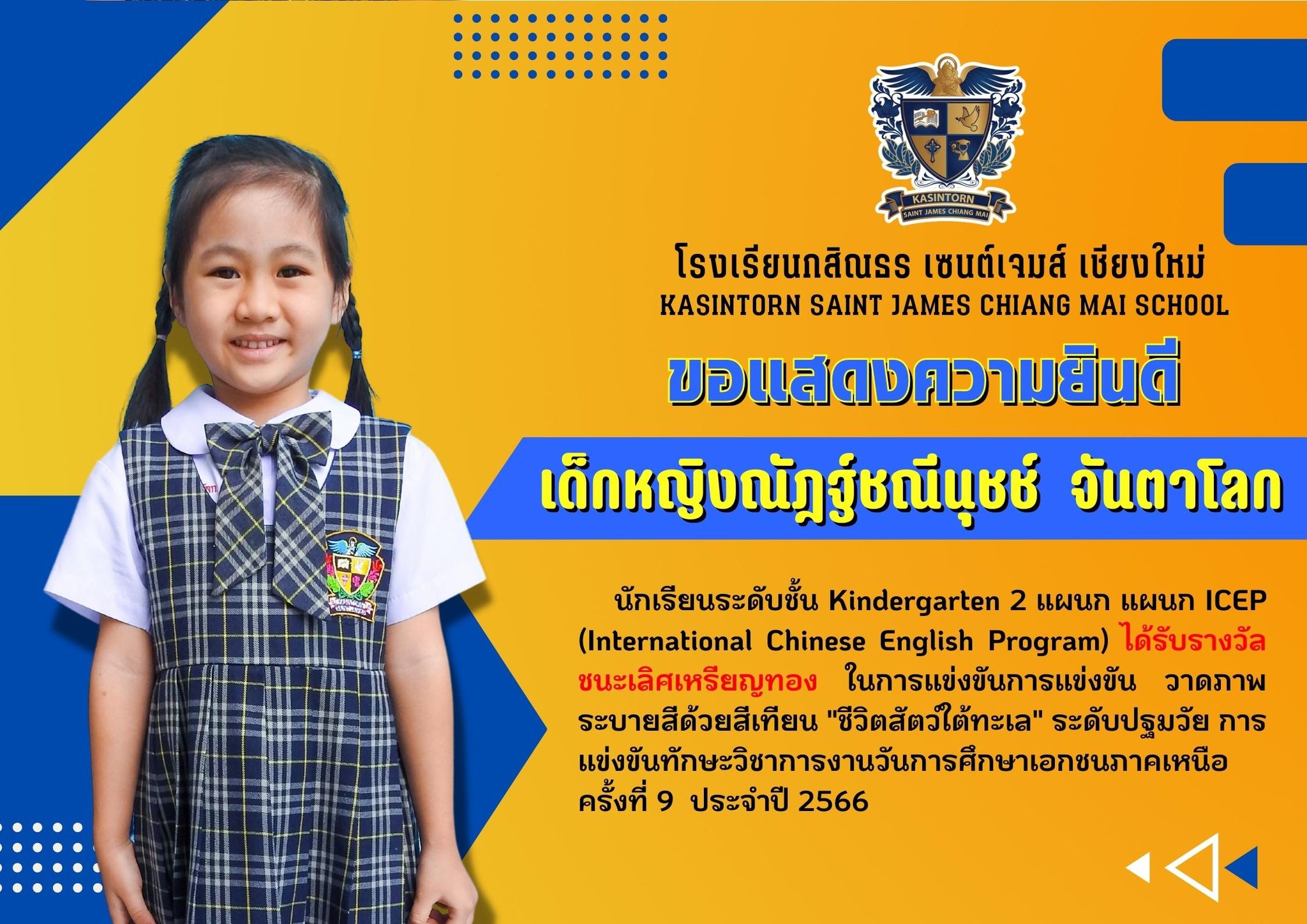 โรงเรียนกสิณธร เซนต์เจมส์ เชียงใหม่ขอแสดงความยินดีกับนักเรียนที่ได้รับรางวัลในการแข่งขันทักษะวิชาการงานวันการศึกษาเอกชนภาคเหนือ ครั้งที่ 9 ประจำปี 2566