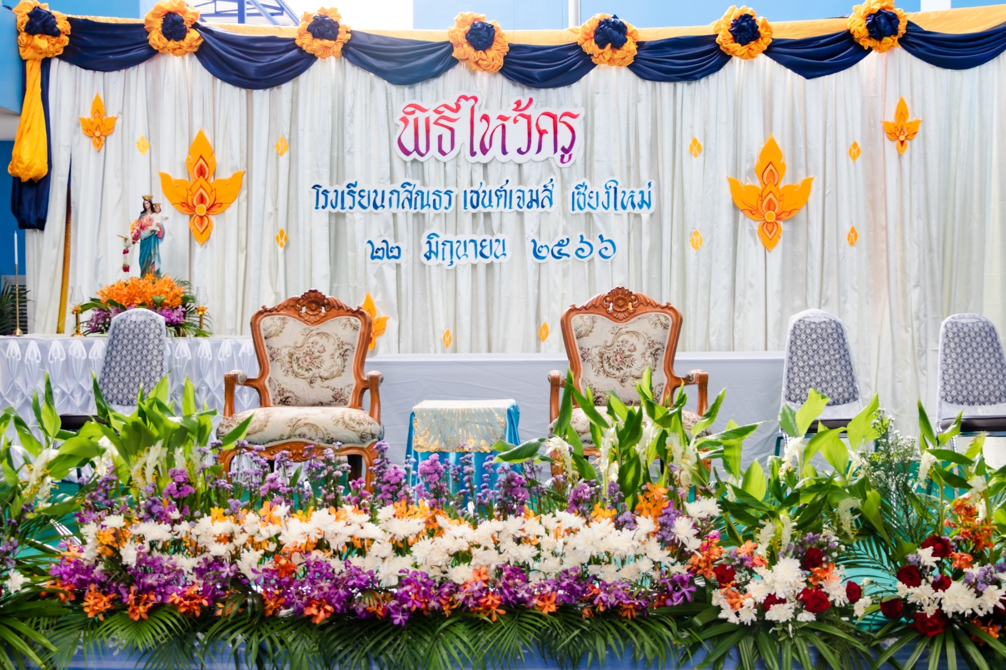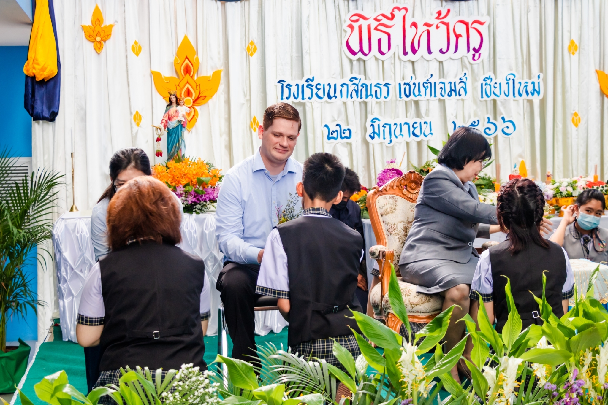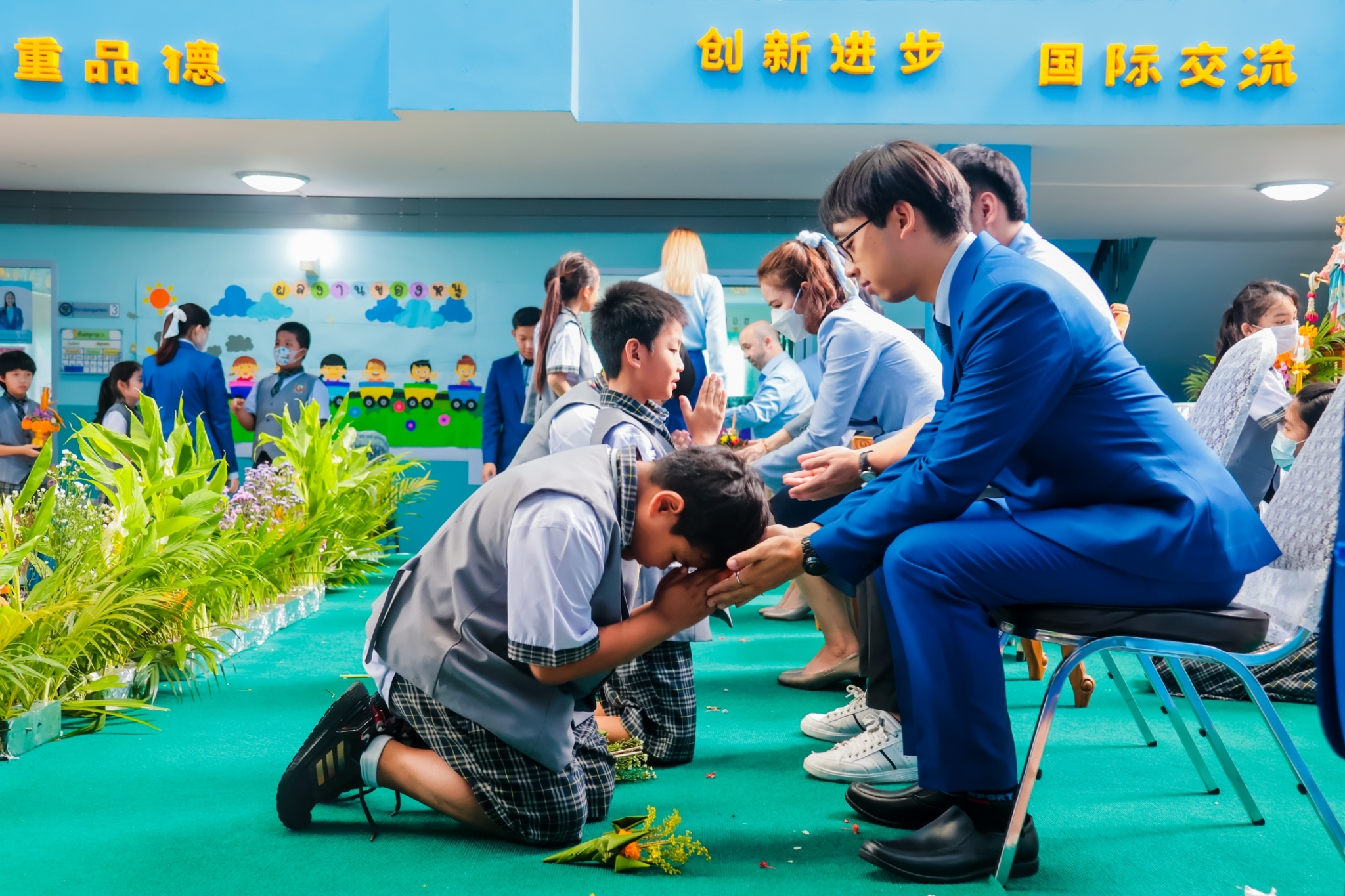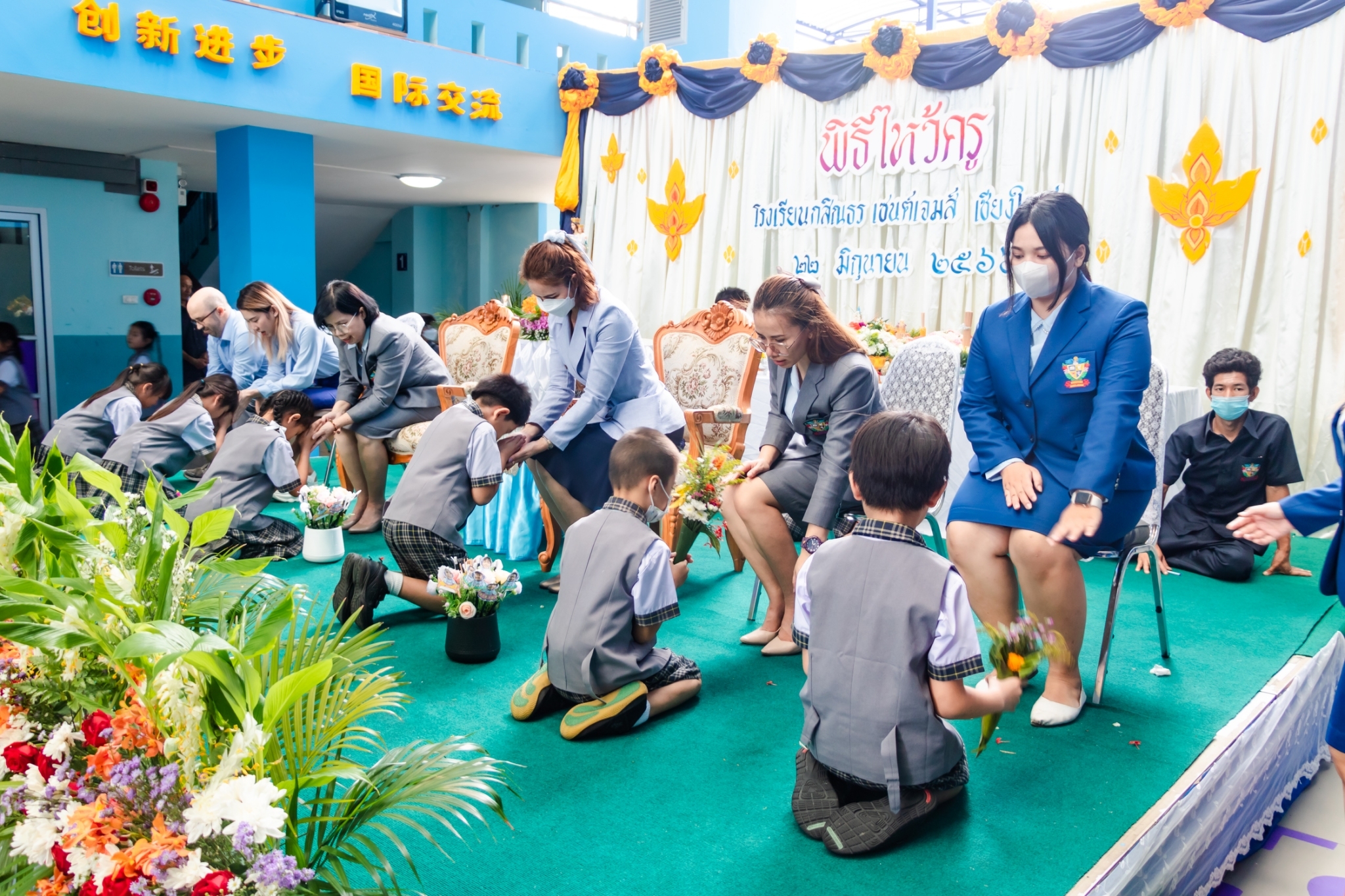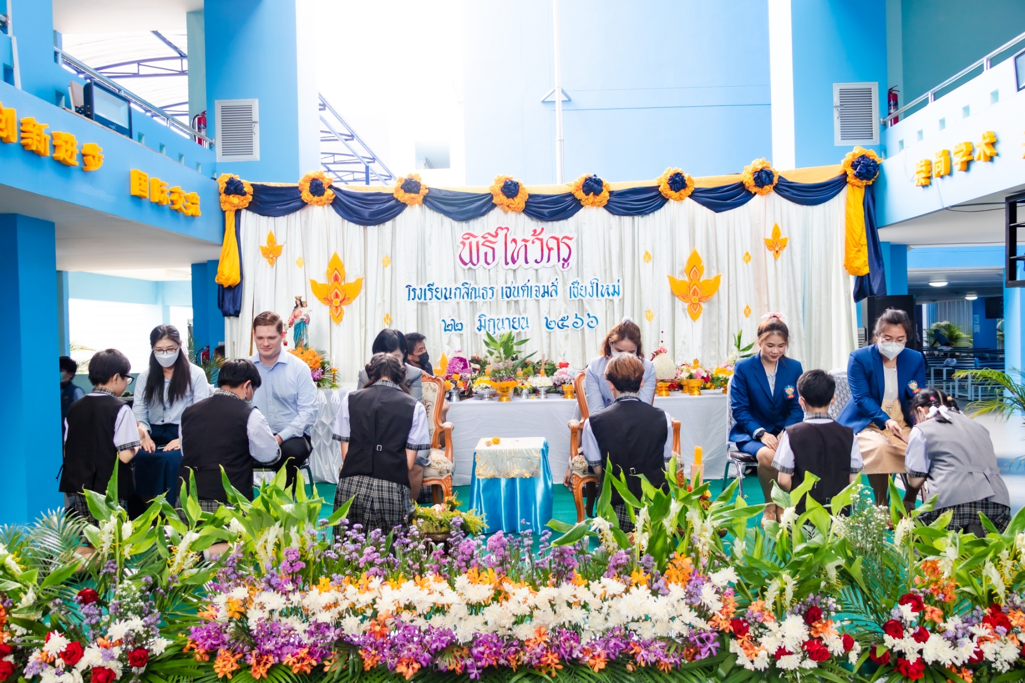 清迈卡辛通圣詹姆斯学校于今日举办了一年一度的拜师仪式,为庆祝2566学年。从幼儿园到高中的学生们都参与了此次敬拜教师的活动,表达对教师们一直以来的爱和尊敬,并为每一位敬业奉献的教师献上鲜花。