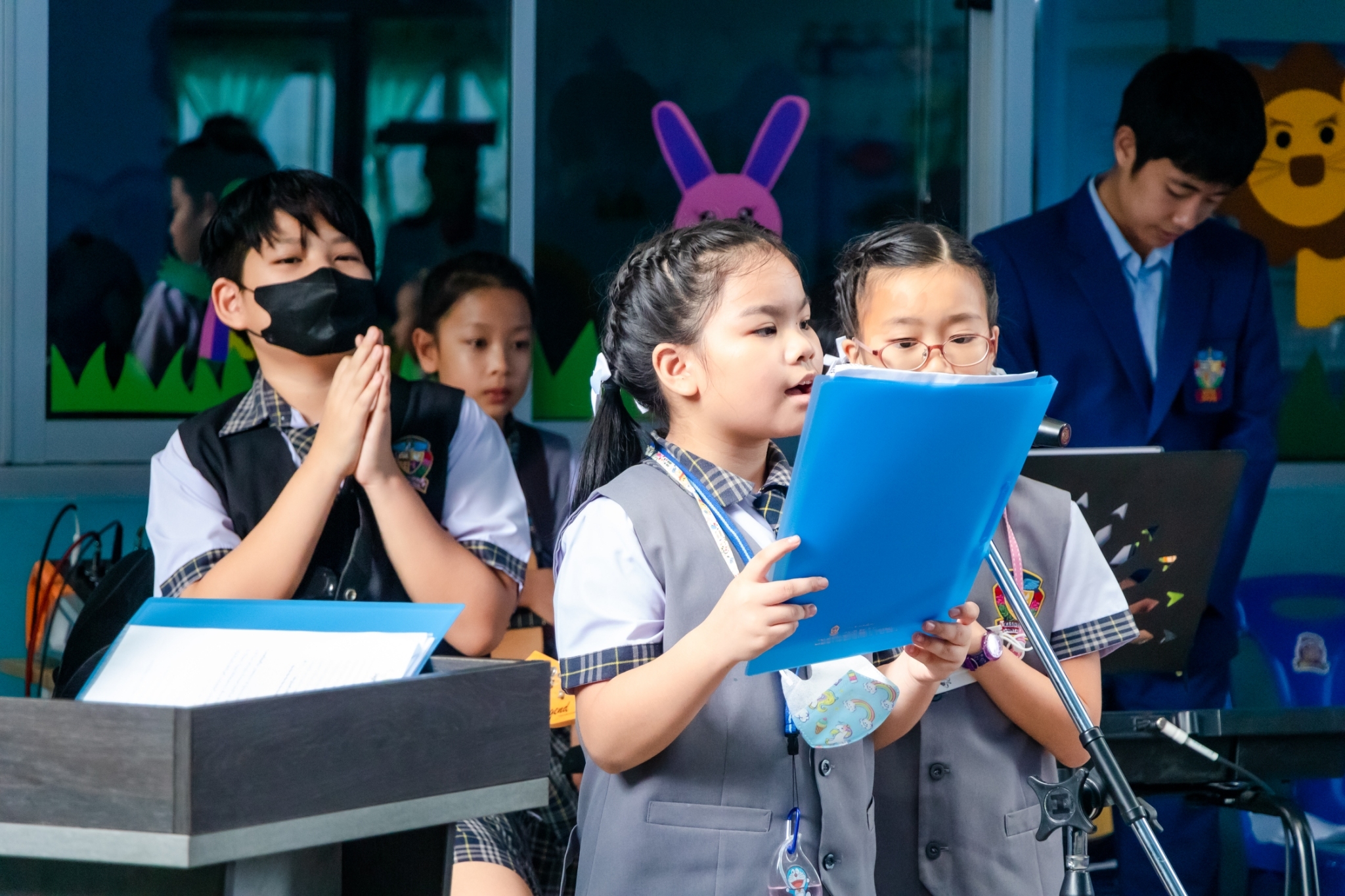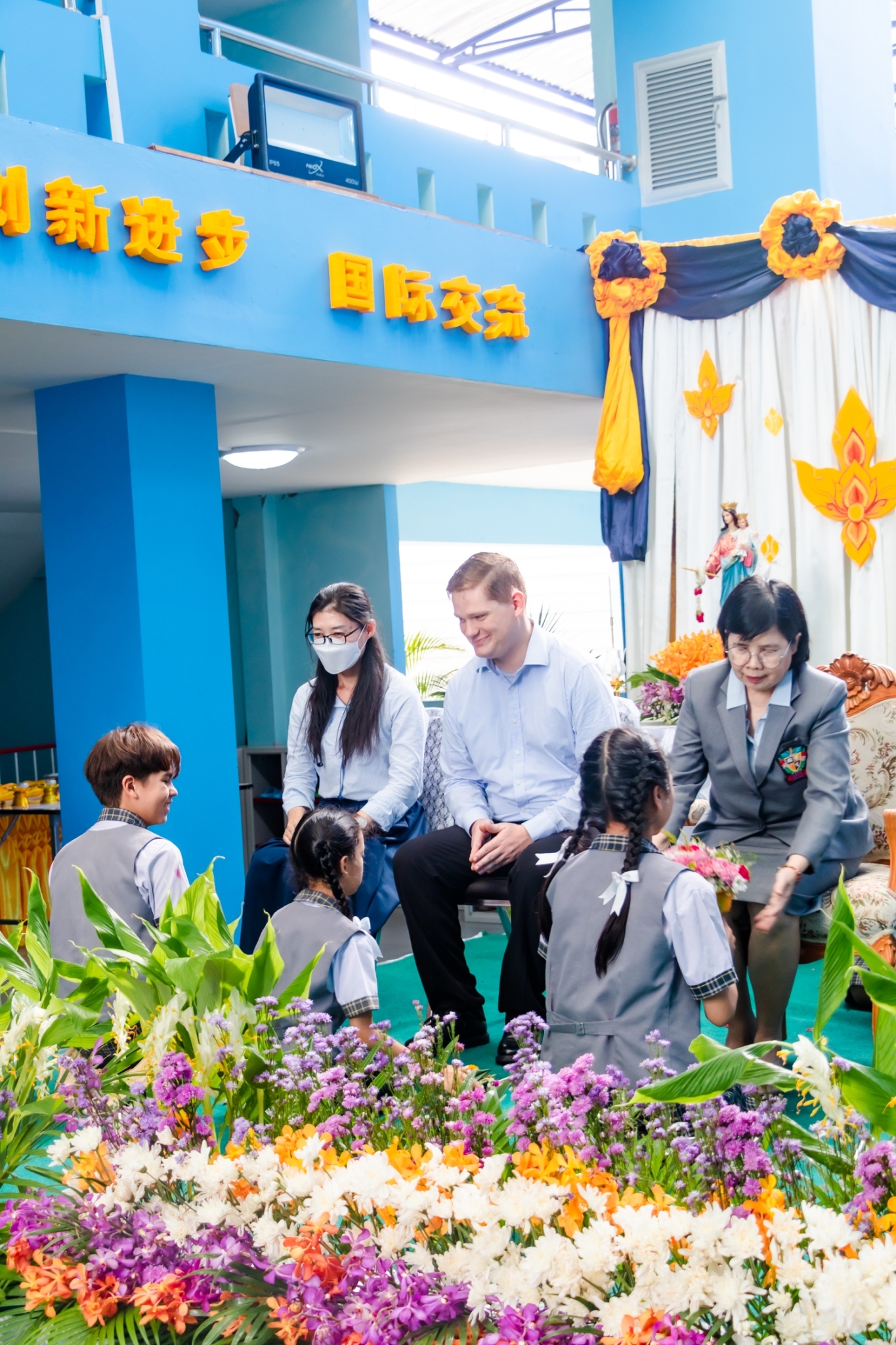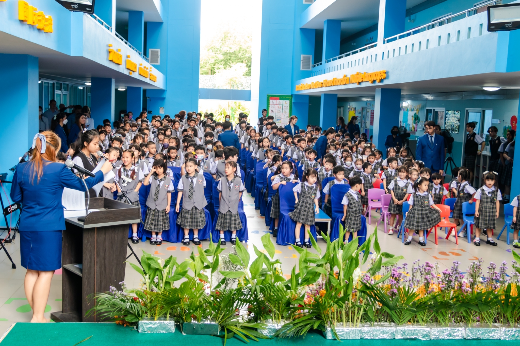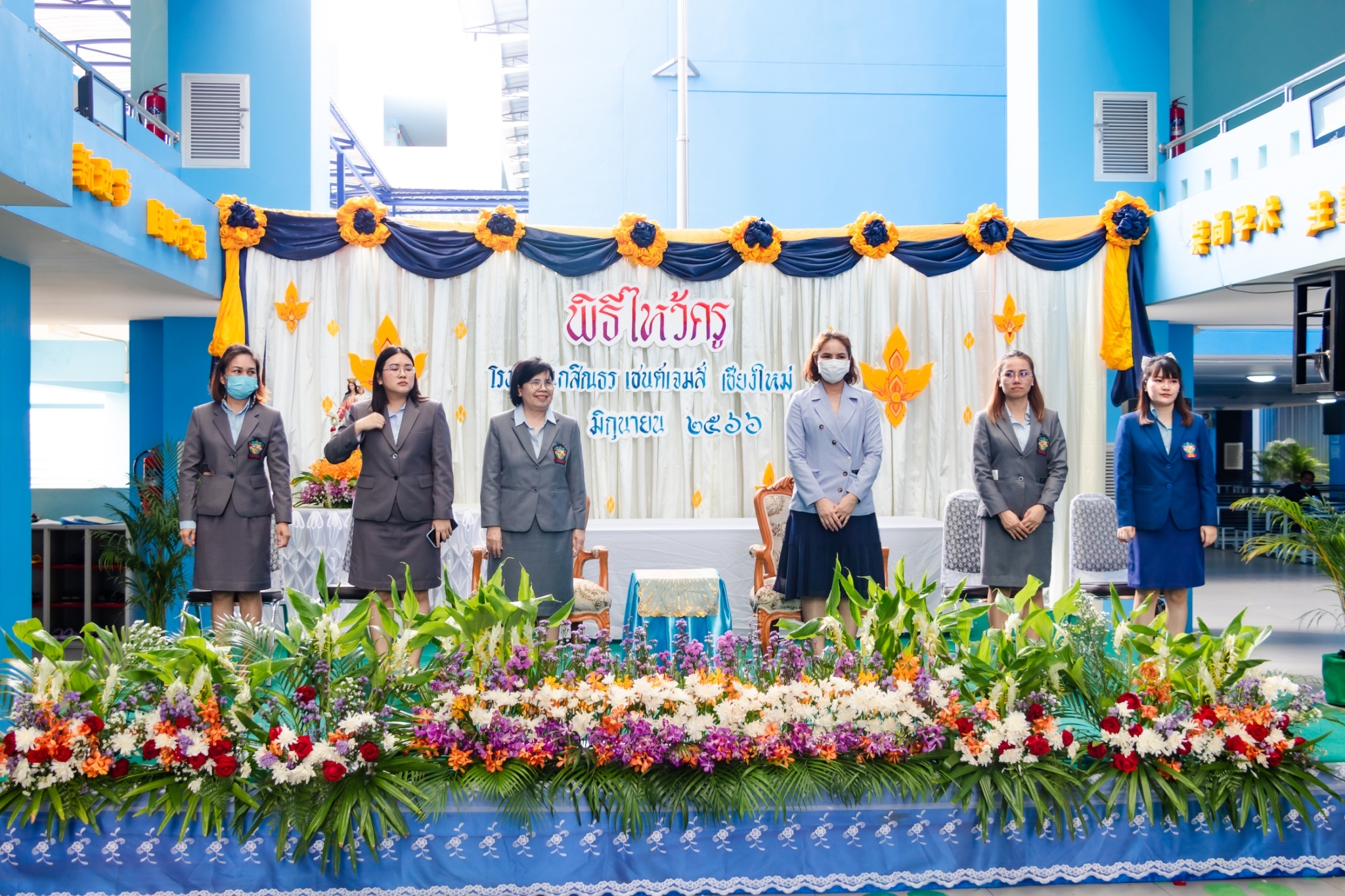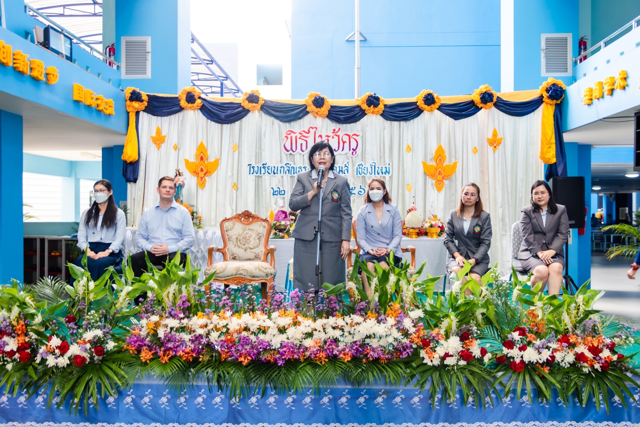 清迈卡辛通圣詹姆斯学校于今日举办了一年一度的拜师仪式,为庆祝2566学年。从幼儿园到高中的学生们都参与了此次敬拜教师的活动,表达对教师们一直以来的爱和尊敬,并为每一位敬业奉献的教师献上鲜花。