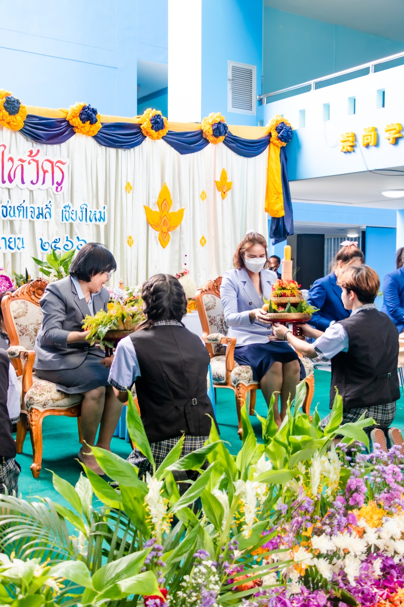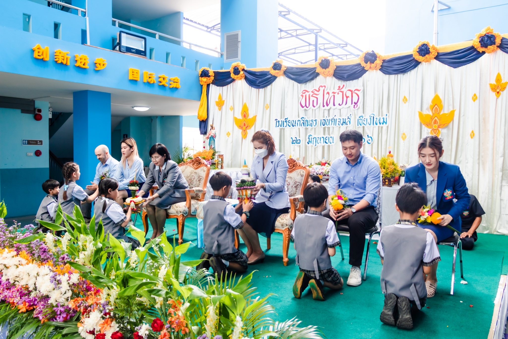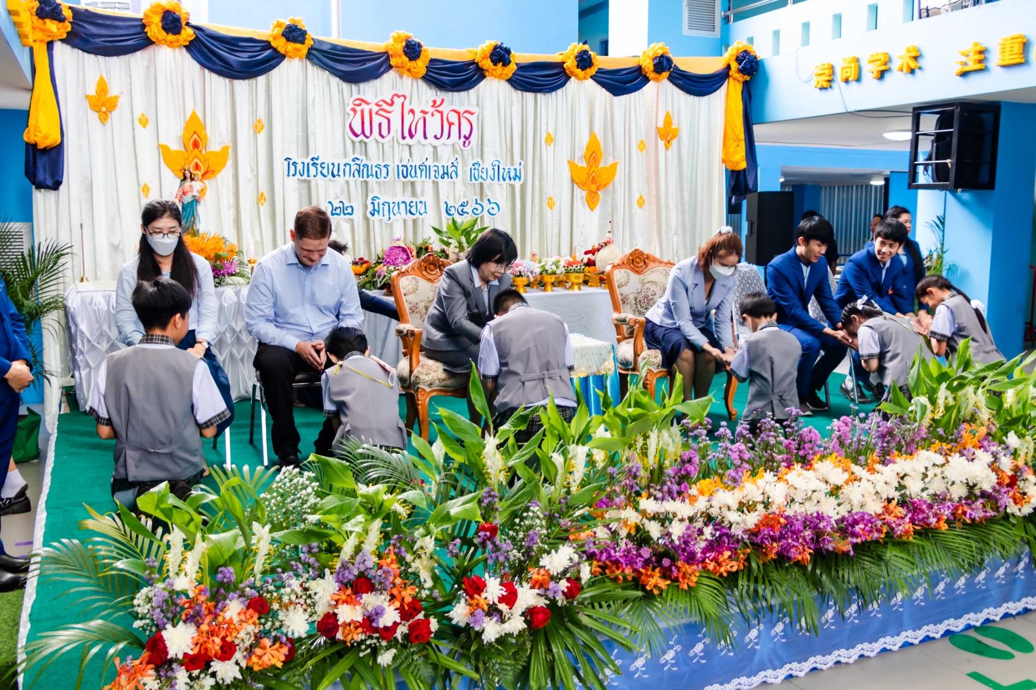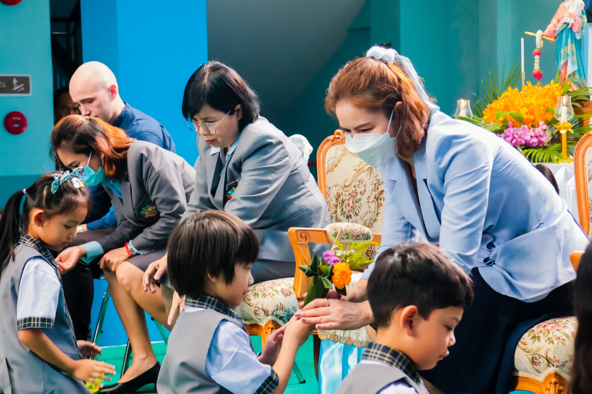 Kasintorn Saint James Chiang Mai School organized a Wai Khru ceremony for the academic year 2023. Students from Kindergarten to secondary levels participated in the ceremony to pay respect to their teachers and show their love by presenting them with flowers.