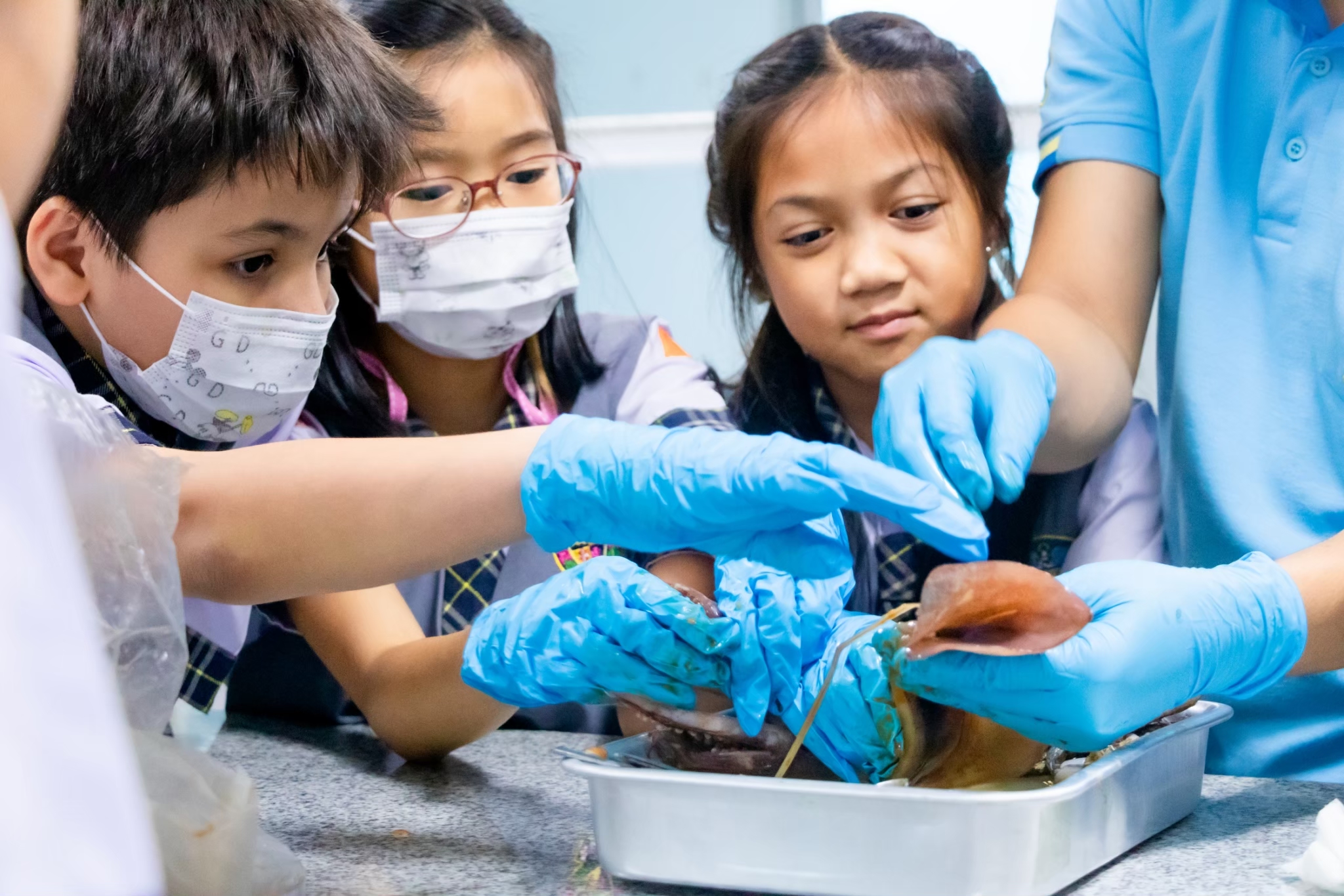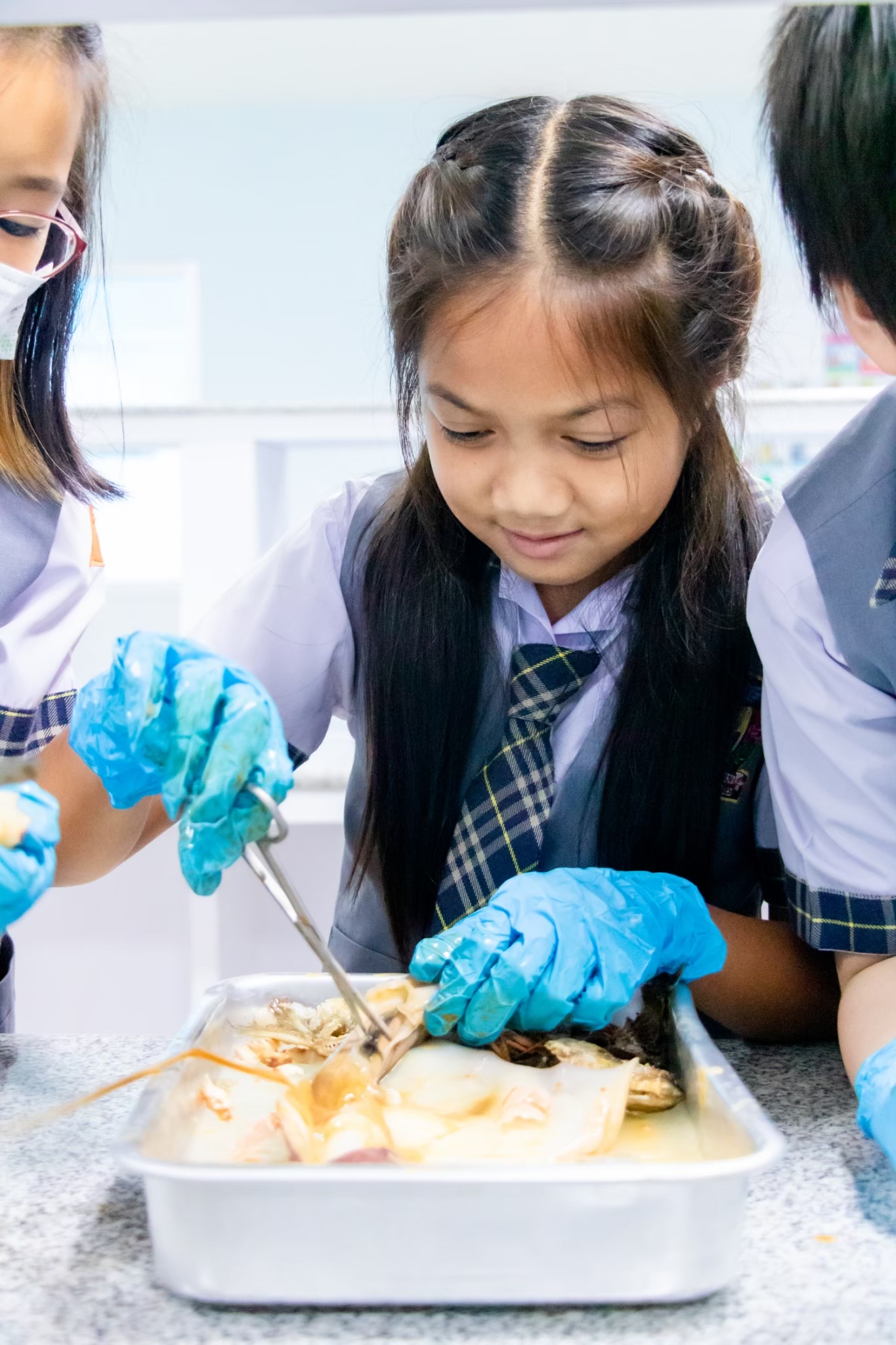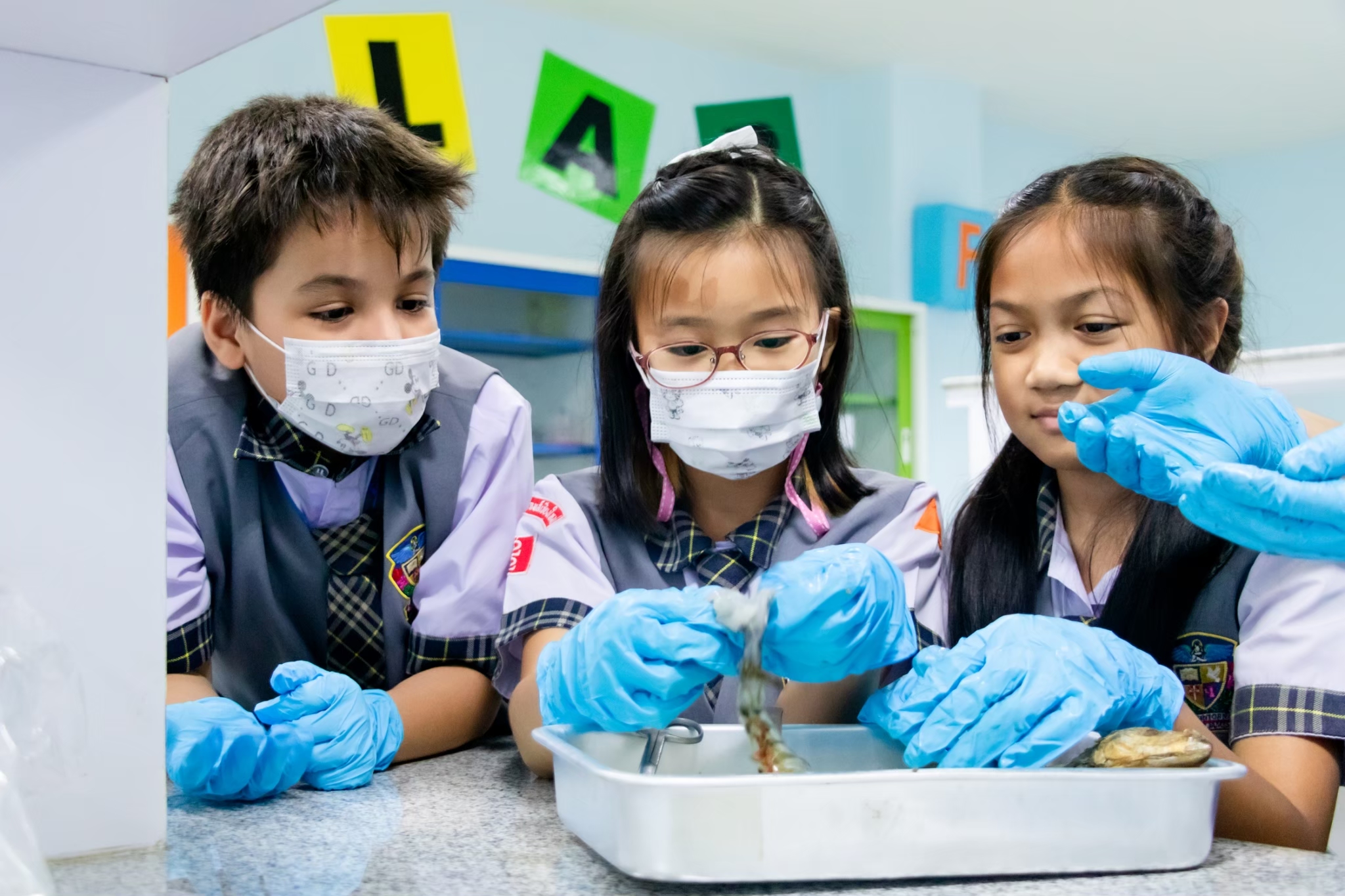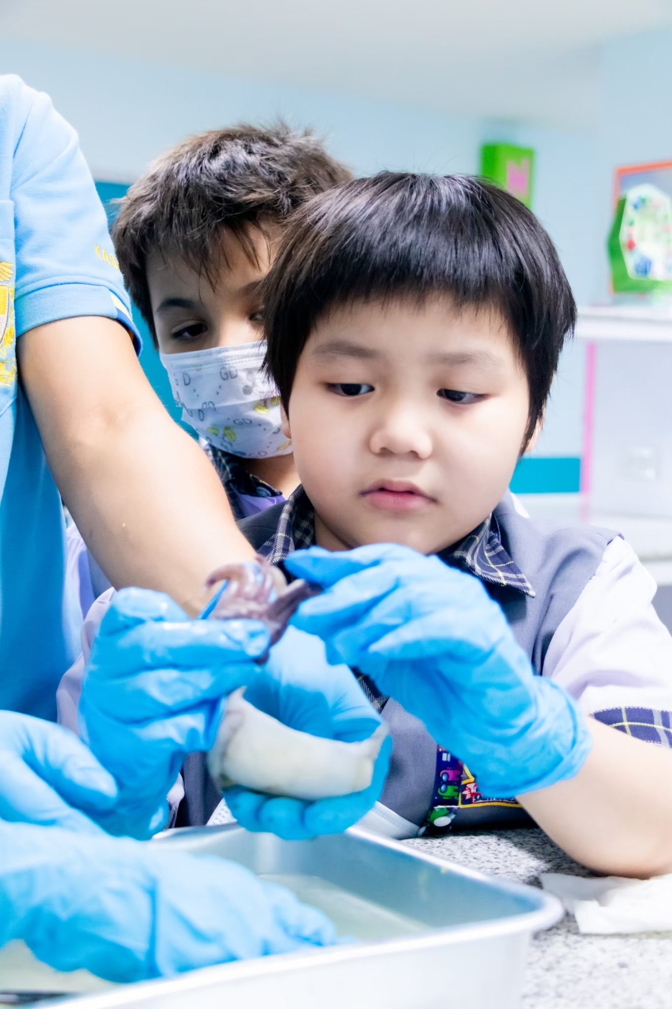 Science Learning Activity : This week, we are exploring the structure of animals with and without a backbone. Students will learn through observation and hands-on practice following the correct procedures. The selected animal examples are shrimp, fish, and squid. The students are highly engaged and interested in conducting the activity successfully.