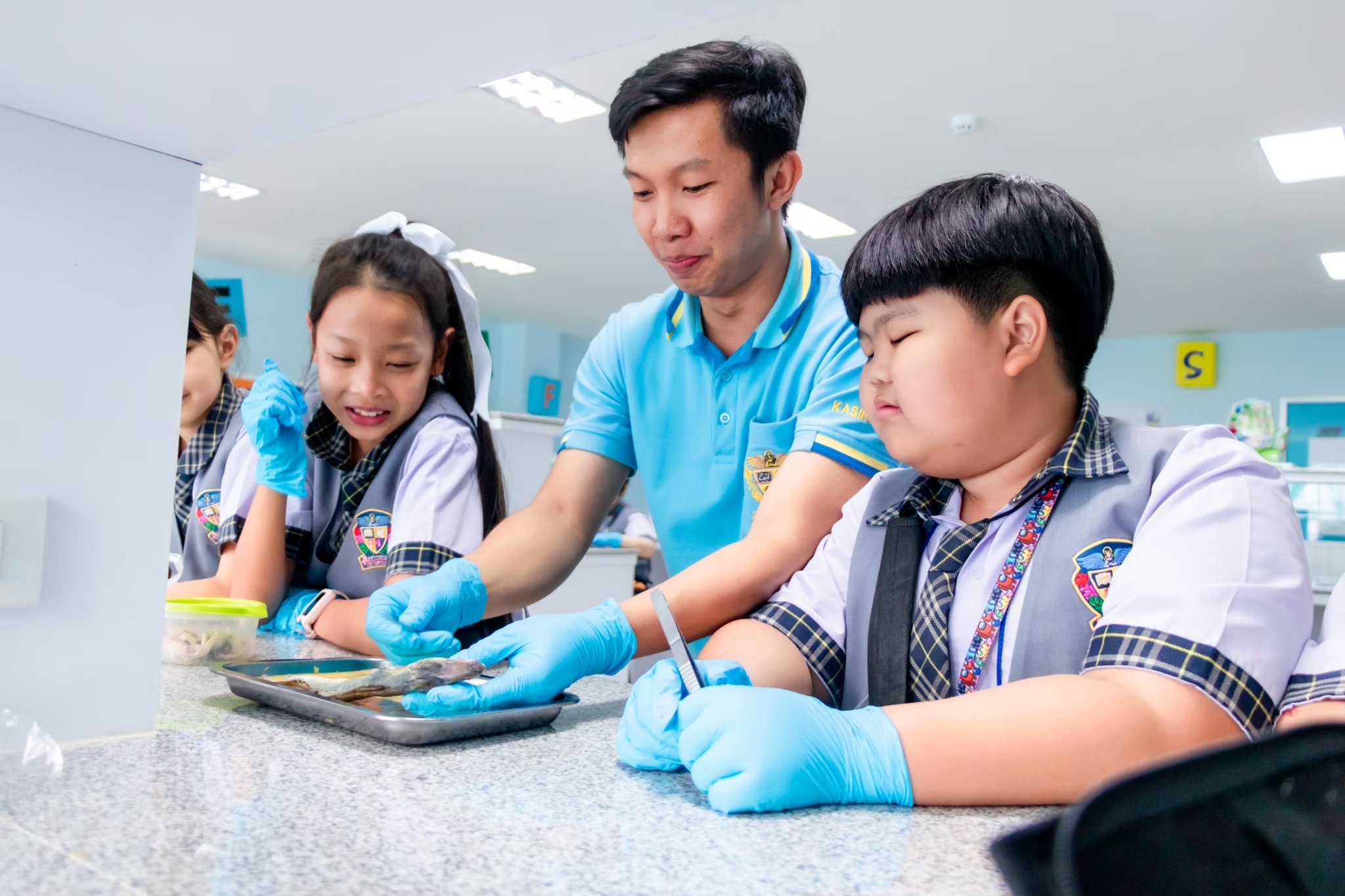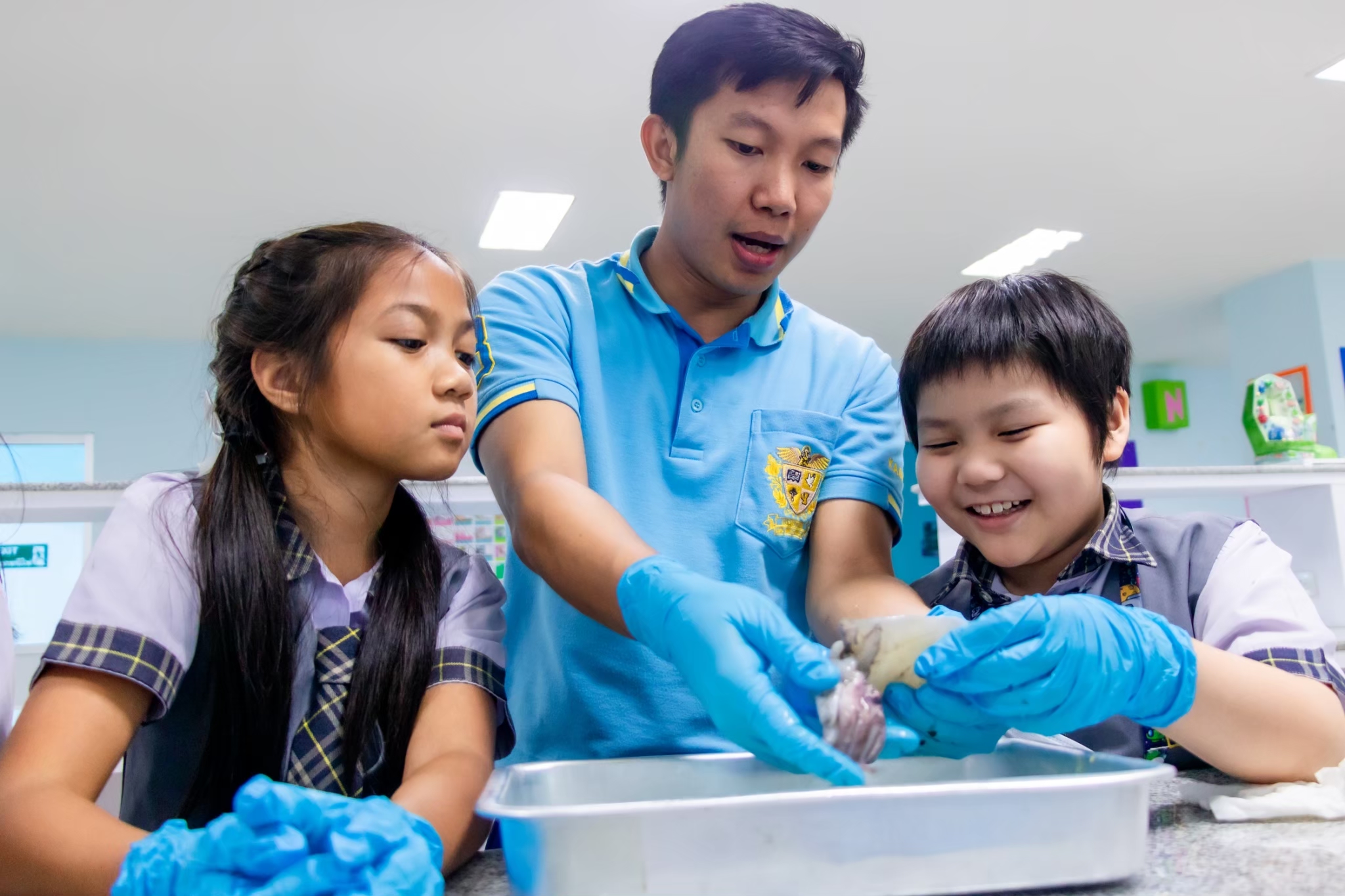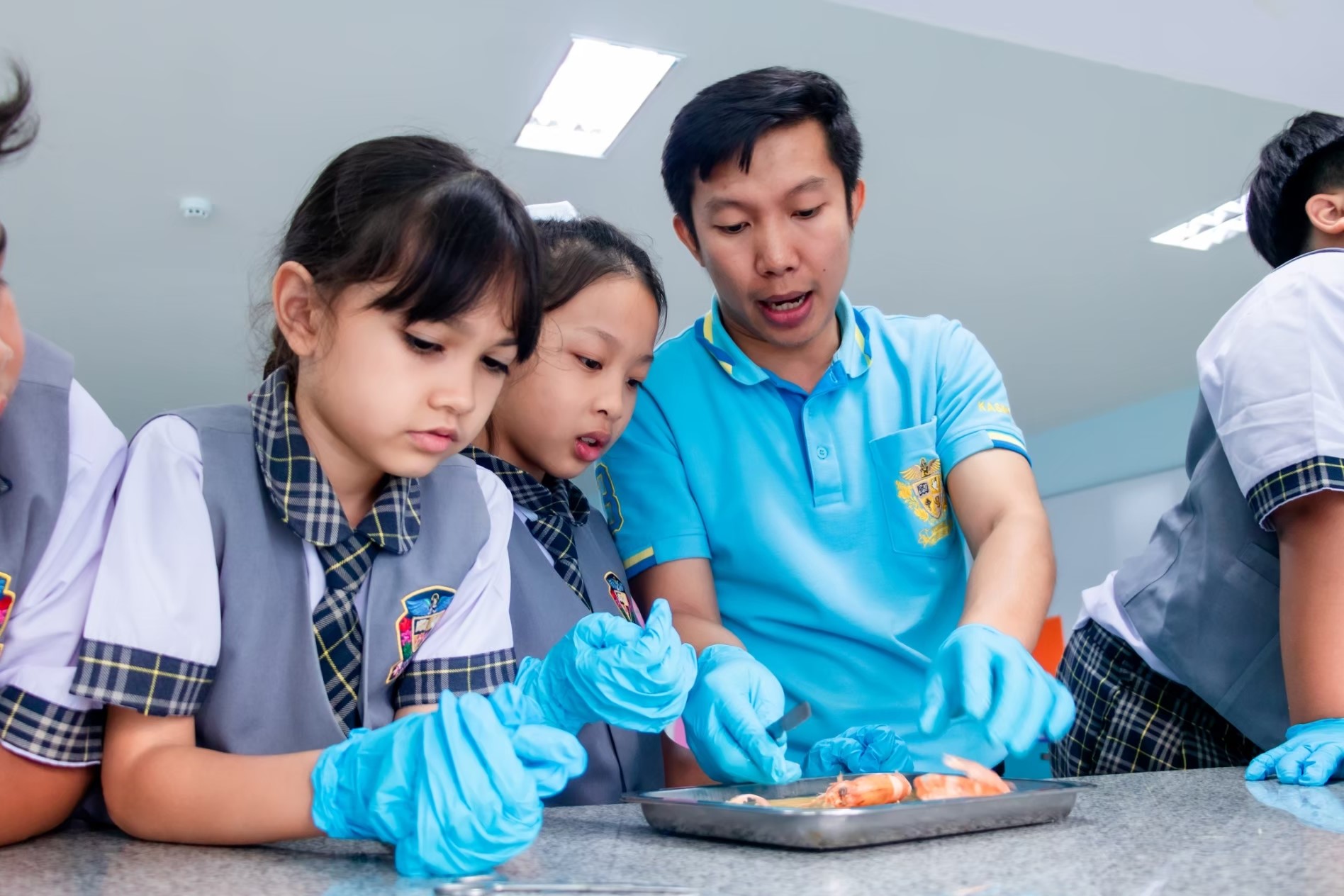 Science Learning Activity : This week, we are exploring the structure of animals with and without a backbone. Students will learn through observation and hands-on practice following the correct procedures. The selected animal examples are shrimp, fish, and squid. The students are highly engaged and interested in conducting the activity successfully.