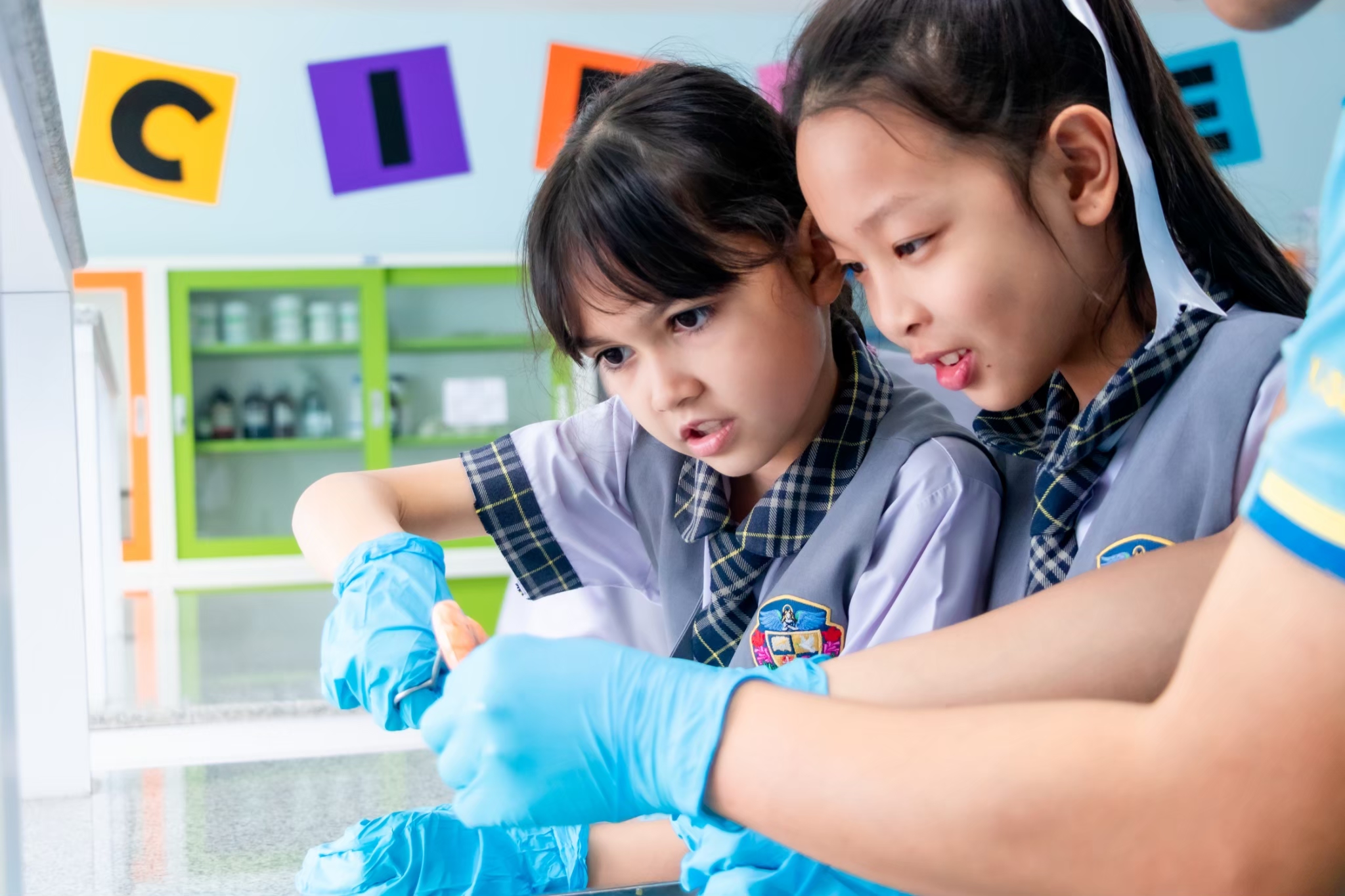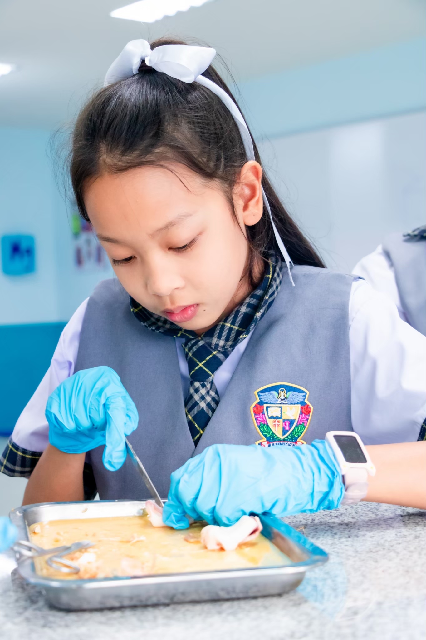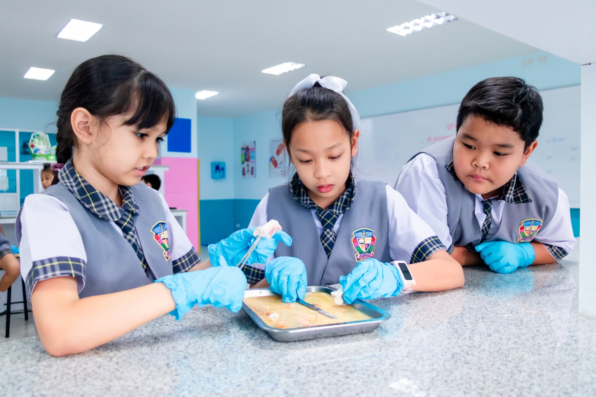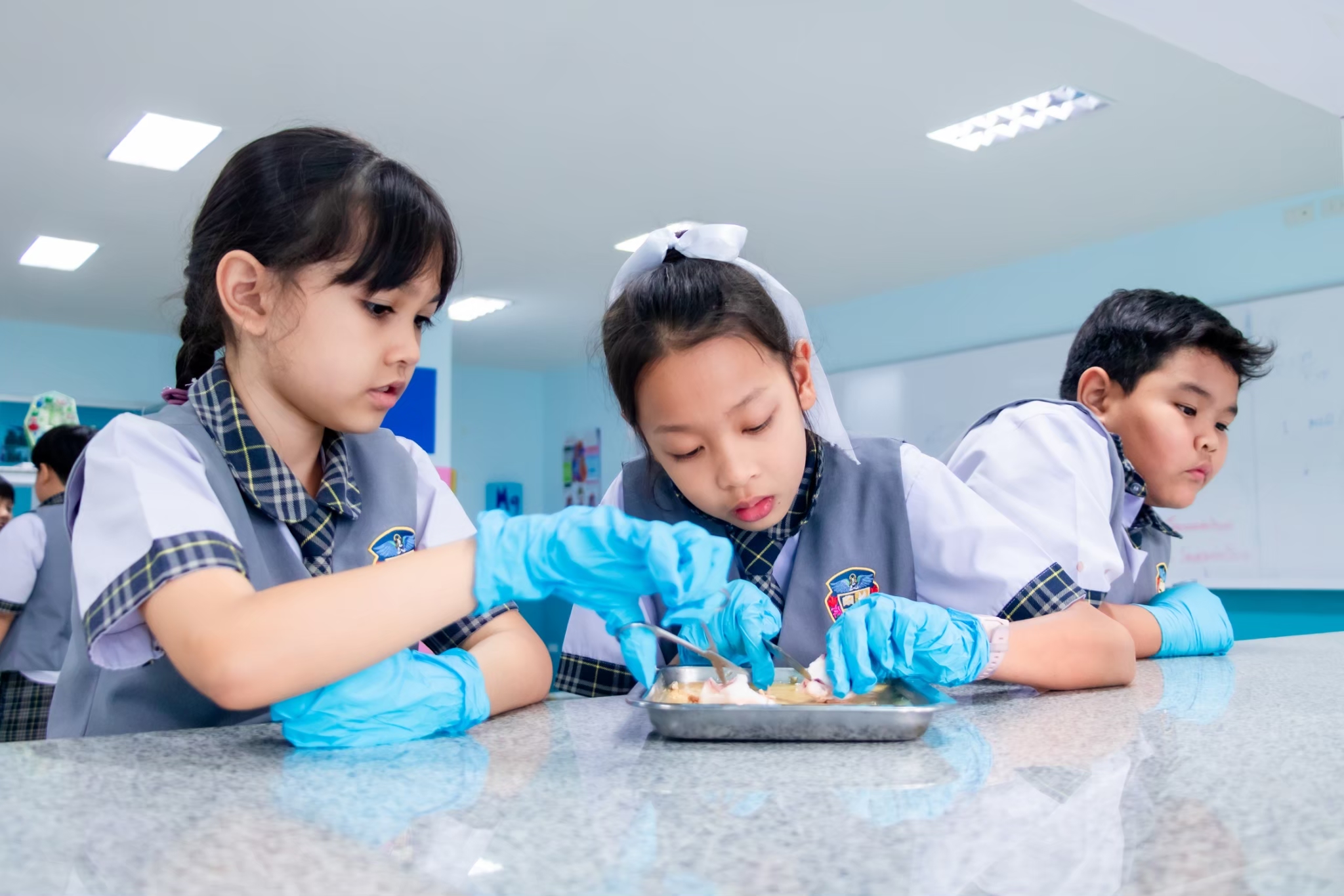 Science Learning Activity : This week, we are exploring the structure of animals with and without a backbone. Students will learn through observation and hands-on practice following the correct procedures. The selected animal examples are shrimp, fish, and squid. The students are highly engaged and interested in conducting the activity successfully.