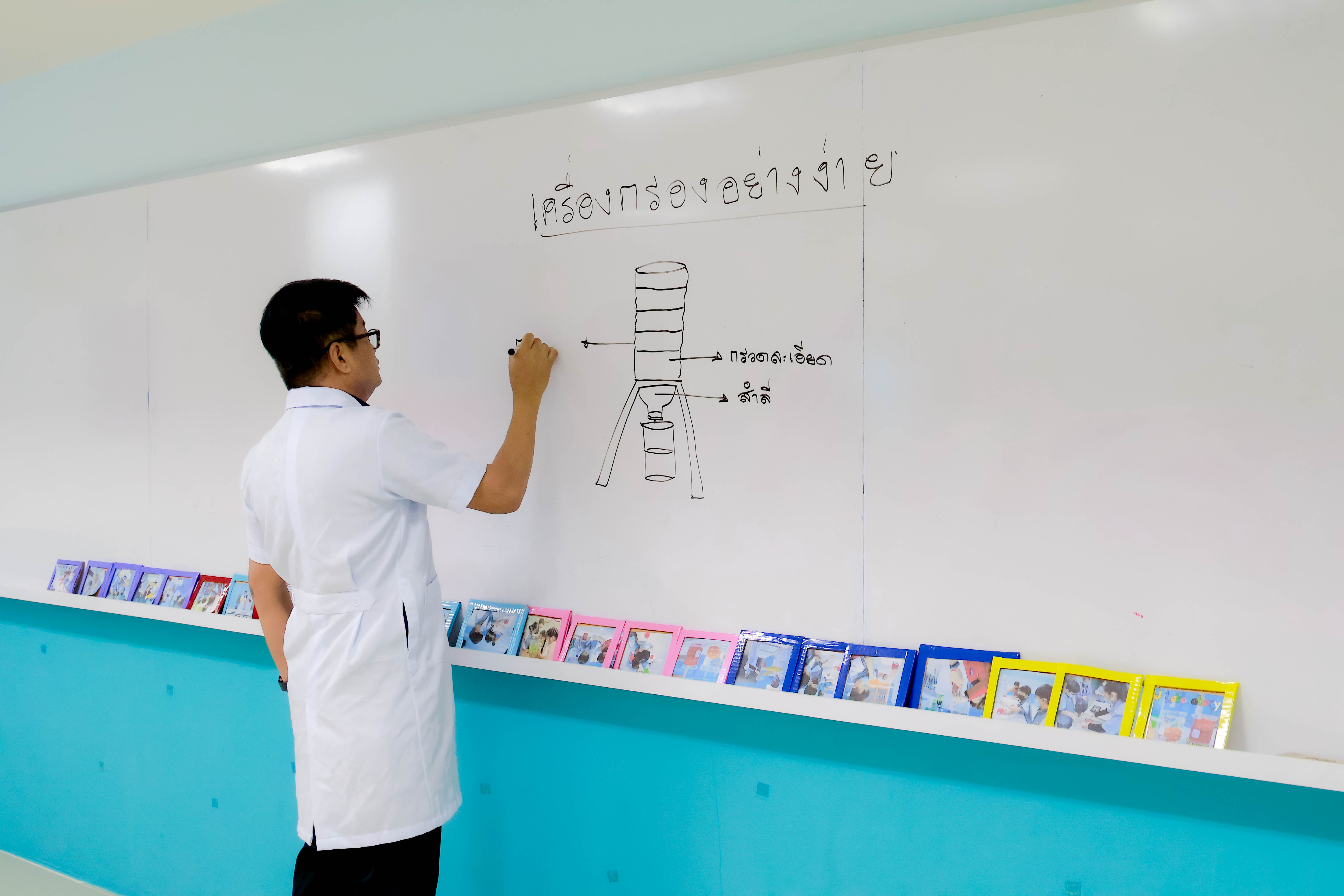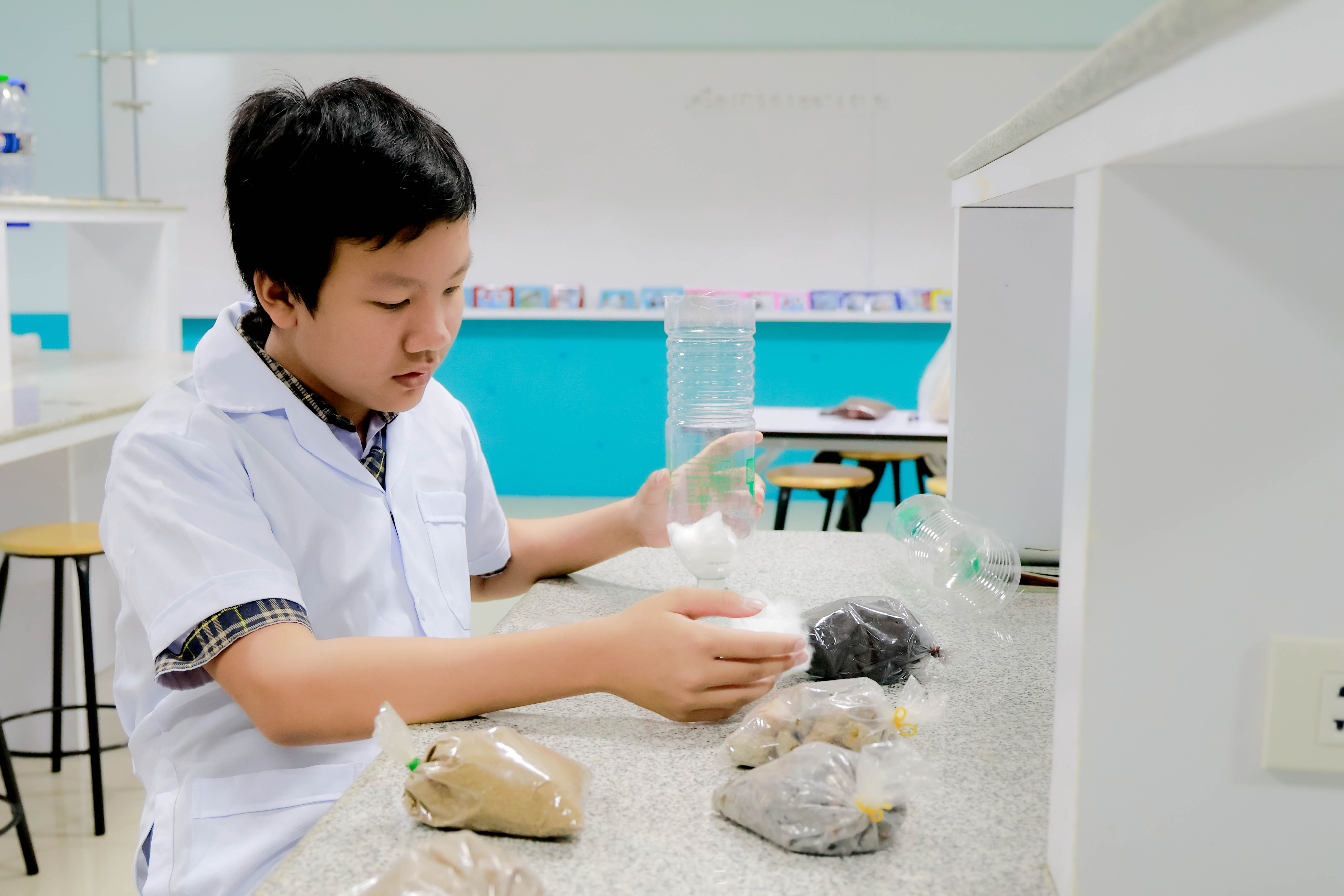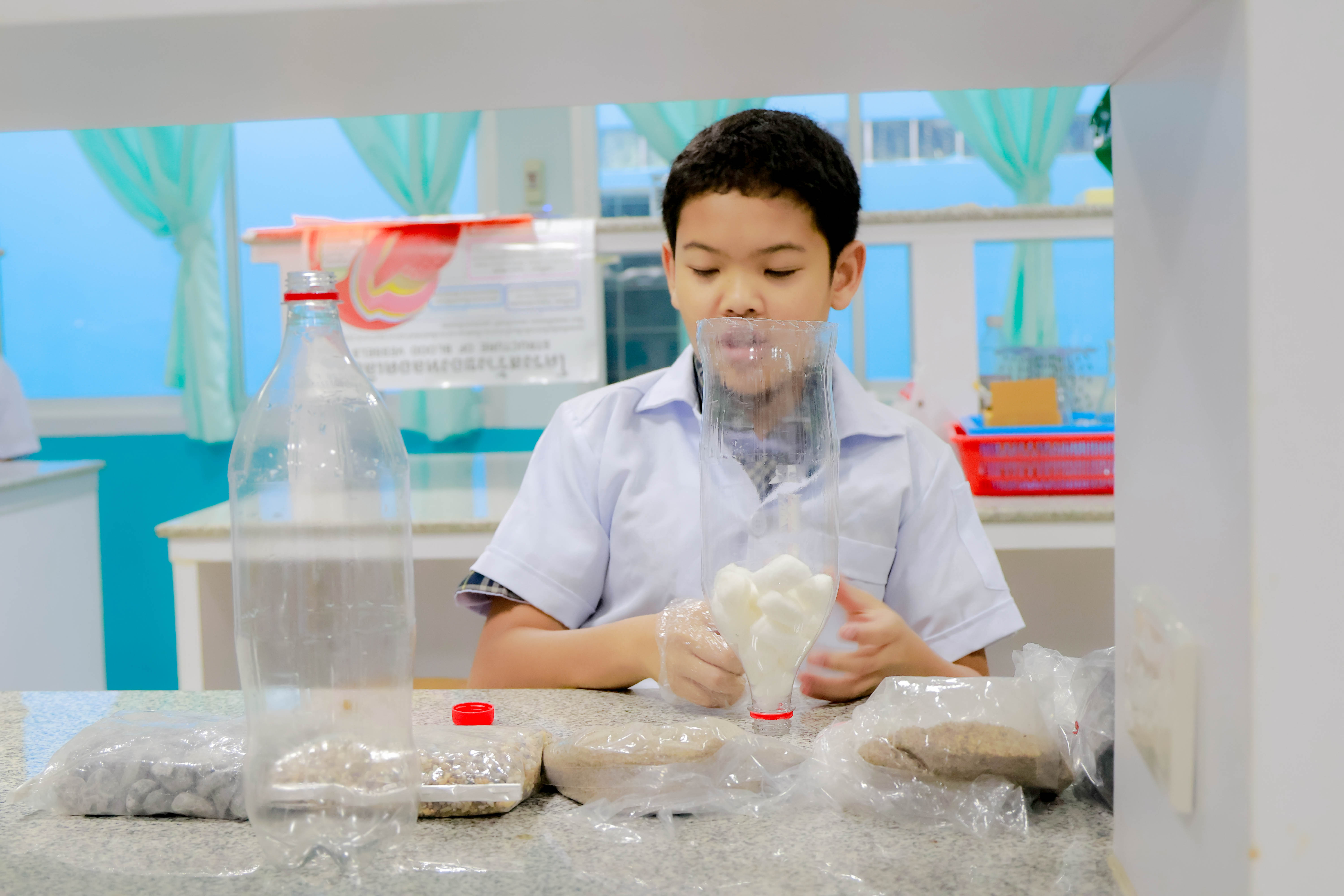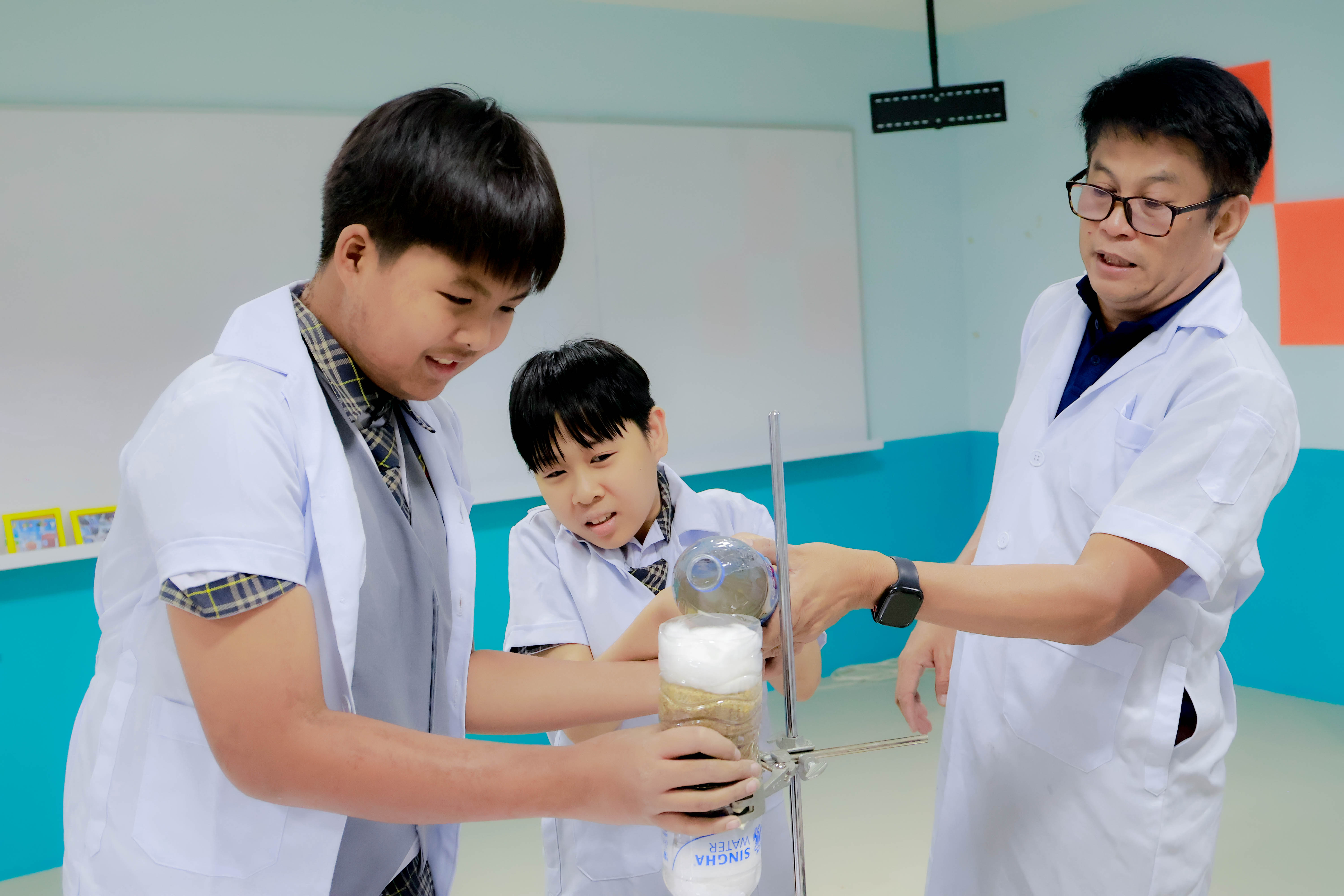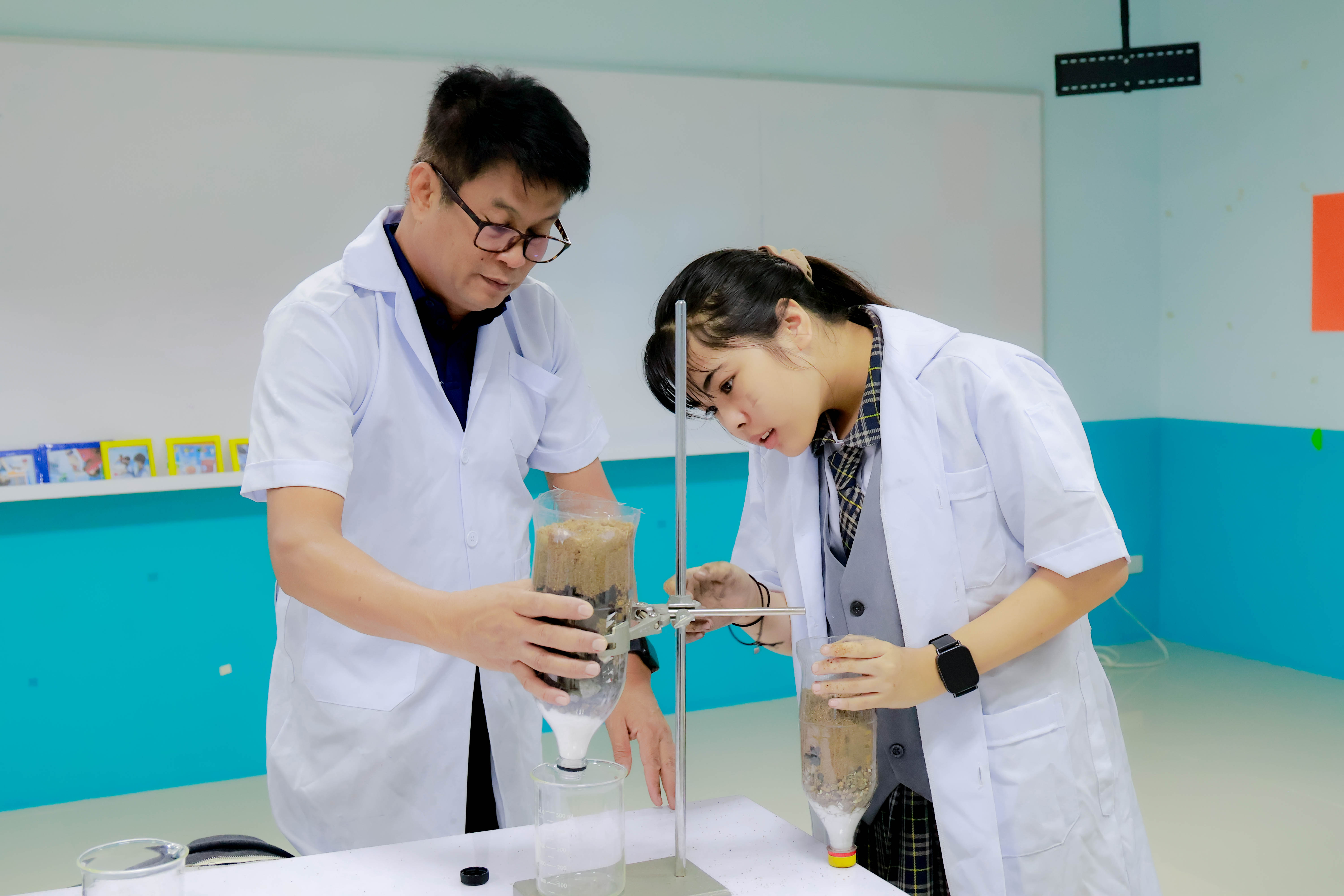 Students from Kasintorn Saint James School Chiang Mai, Grade 6, conducted an experiment on Separation of Mixtures using a simple filtration apparatus. Substances separated by filtration are mixtures of a solid mixed with a liquid or are used to separate suspensions from water, such as filtering canal water. The filtered canal water will become clean and can be used.